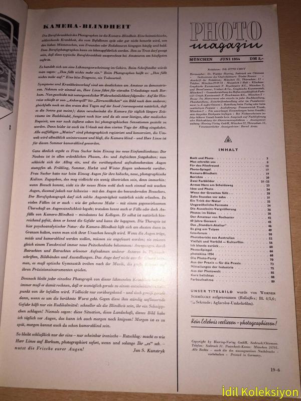 Photo Magazine : Juni 1954- München - Almanca Dergi (Buch und Photo - Man schreibt uns - Für den Filmfreund - Photo Spiegel - Kamera Blindheit - Berichte - Zwei Farbbilder - Armes Herz am Scheideweg - Idee und Photo - Wenn der Groschen fallt - Zehn Stunden vor zehn - Ein Trick der Natur - Ungewöhnliche Formate - Die Ausschnitt Vergröberung - Photos im Süden - Der Amateur von Rochester - 60 Jahre Gevaert - Das Standort Atelier - Es ging um Tulpen - Photobericht aus Australien ) Hafif Yıpranma ve Kesilmiş Kısımlar Mevcut