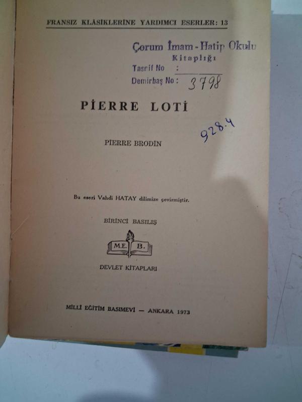 Pierre Loti, Pierre Brodin tarafından kaleme alınmıştır. Kitap 1973 yılında MEB ( Milli Eğitim Bakanlığı Yayınları ) tarafından [Ankara] yayınlanmıştır. Bu baskının çevirisi Vahdi Hatay tarafından yapılmıştır. 143 sayfadır. Sayfa bilgisi viii+143 s. olarak belirtilmiştir. Pierre Loti adlı eser Türkçe dilindedir.