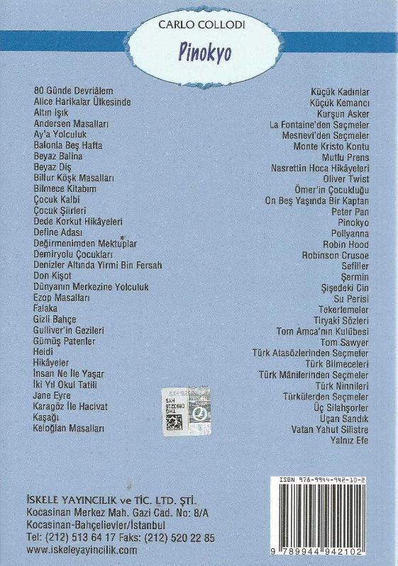 Pinokyo, Carlo Collodi tarafından kaleme alınmıştır. Kitap İskele Yayıncılık tarafından 9789944942102 ISBN kodu ile yayınlanmıştır. 120 sayfadır. Pinokyo adlı eser Türkçe dilindedir.