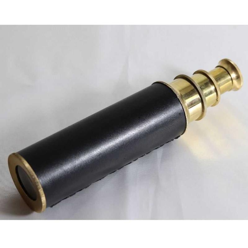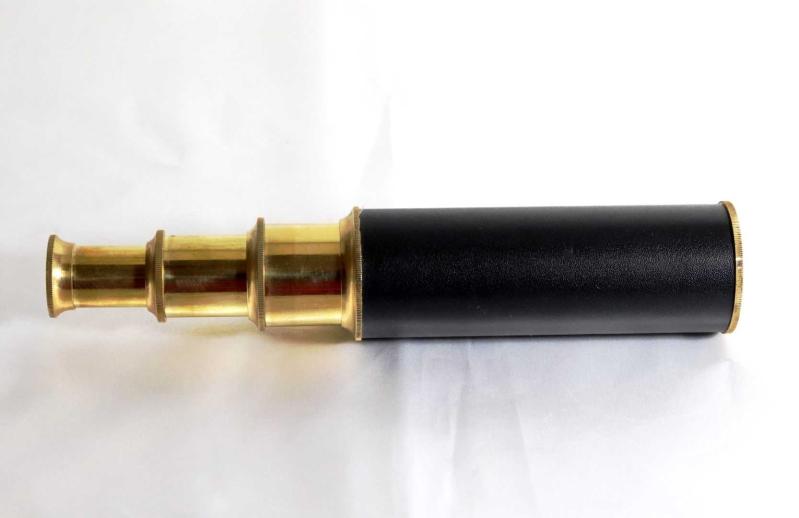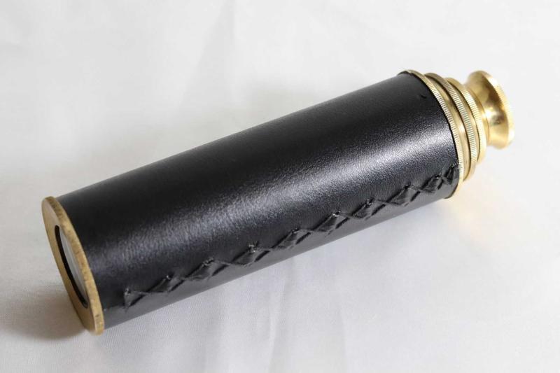 Pirinç 4 kademeli açılabilir gemici dürbünü. Sapı siyah deri kaplı. Net görüntülü. Boyu kapalı:14cm. Açık:37,5cm.