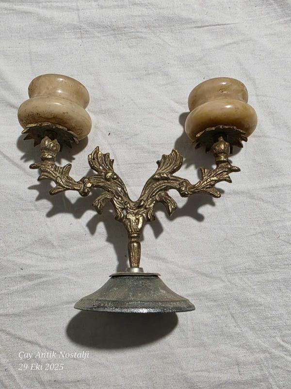 Pirinç ve mermer ikili şamdan 15 cm boyunda başlıklı antika/koleksiyon objesi Türkiye menşe’lidir. 1960-1979 arası dönemine aittir.
