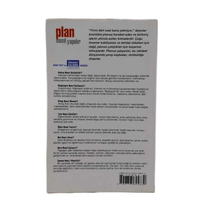 Plan Nasıl Yapılır, Ron Fry tarafından kaleme alınmıştır. Kitap 2000 yılında Timaş Yayınları tarafından [İstanbul] yayınlanmıştır. Satışta olan kitap, yayınevinin 1. baskısıdır. Bu baskının çevirisi Feride Kurtulmuş tarafından yapılmıştır. 124 sayfadır. Sayfa bilgisi 3.hamur olarak belirtilmiştir. Plan Nasıl Yapılır adlı eser Türkçe dilindedir.