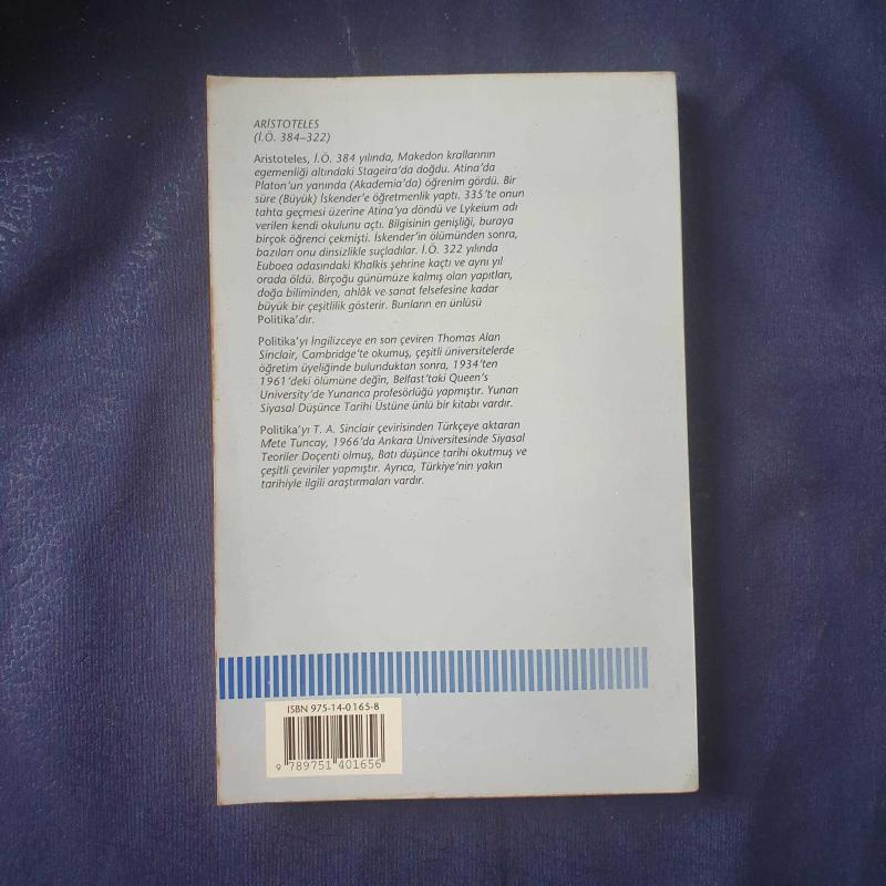 Politika, Aristoteles tarafından kaleme alınmıştır. Kitap 1993 yılında Remzi Kitabevi tarafından [İstanbul] yayınlanmıştır. Satışta olan kitap, yayınevinin 4. baskısıdır. Bu baskının çevirisi Mete Tunçay tarafından yapılmıştır. 246 sayfadır. Politika adlı eser Türkçe dilindedir.