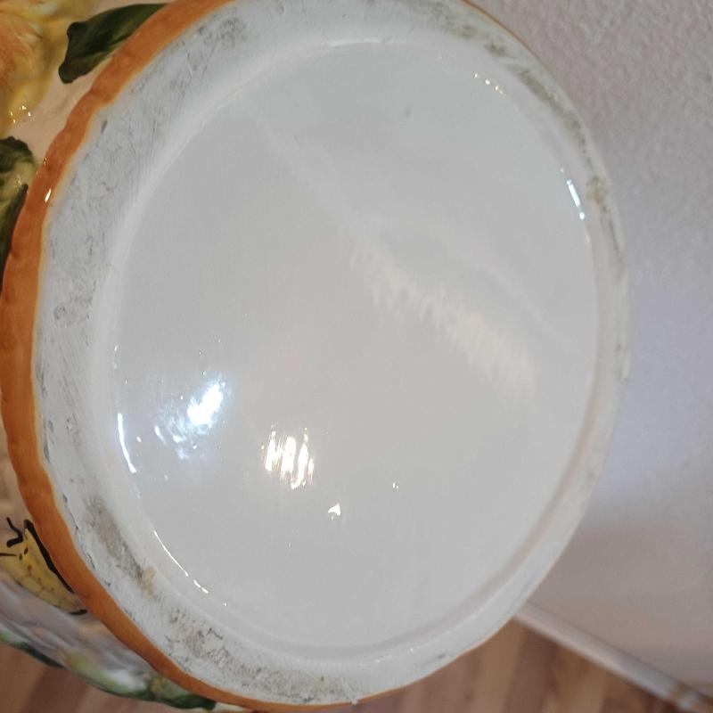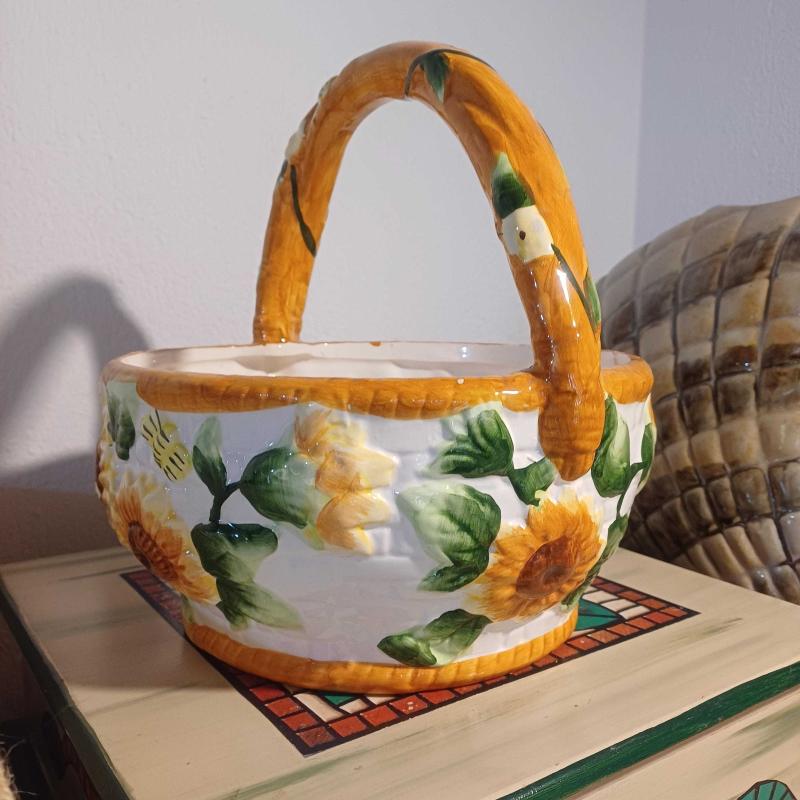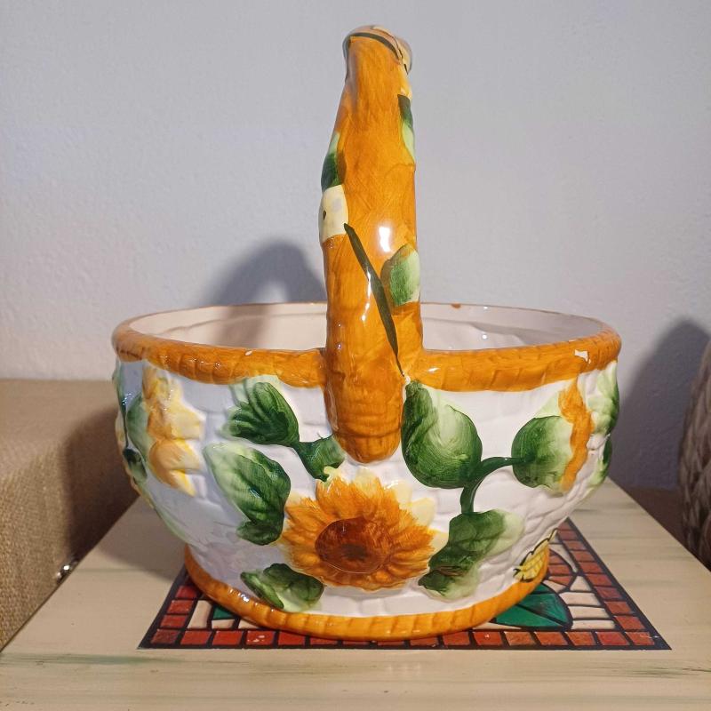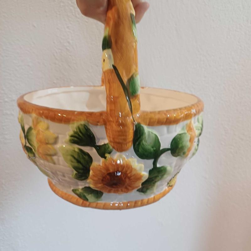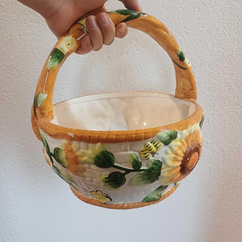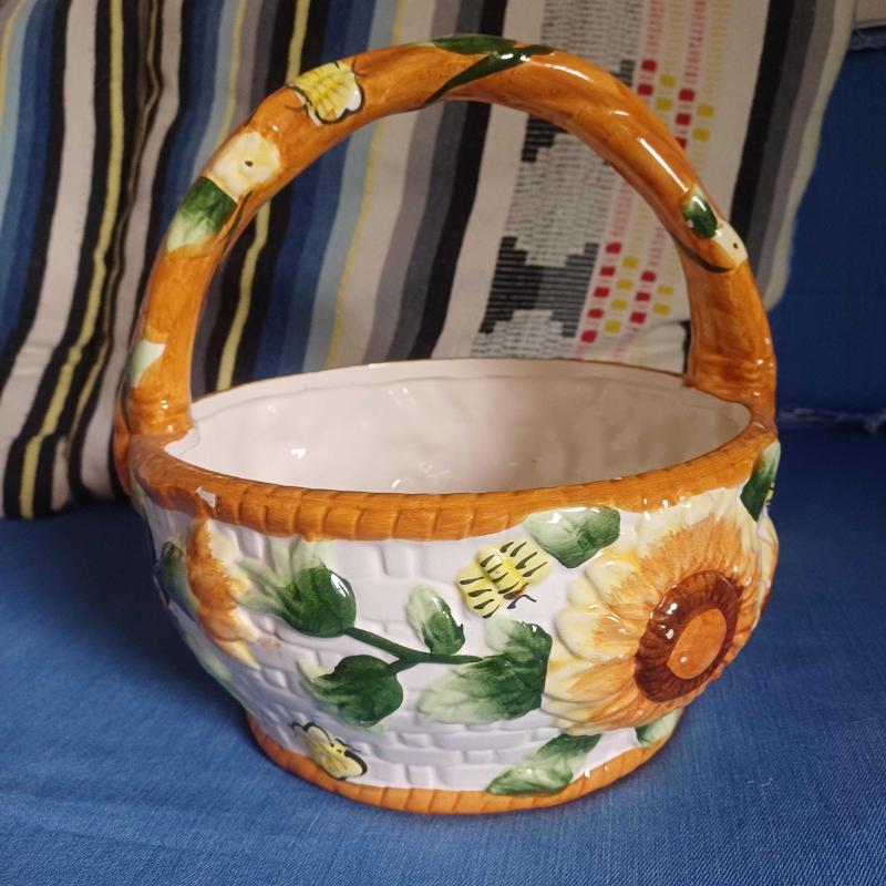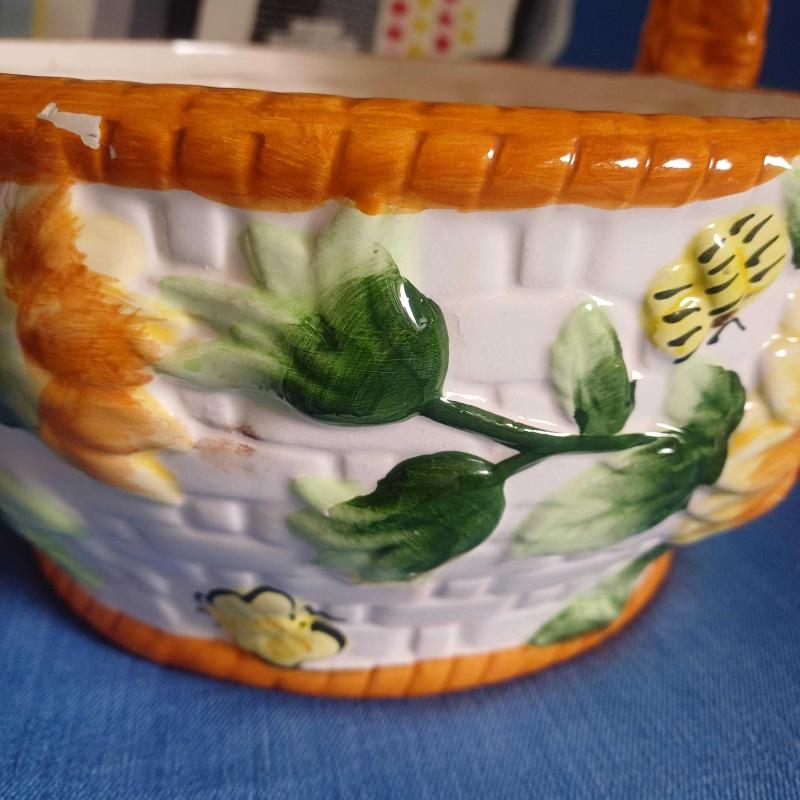 Harika büyük boy porselen sepet. Çok çok iyi durumda. Turuncu renk ağırlıklı. Hasir dokulu ve çiçek,yaprak,kelebek rölyefli. Alt cap 17 cm Üst cap 25 cm Kulplu yükseklik 30 cm Sepet yüksekliği 12 cm