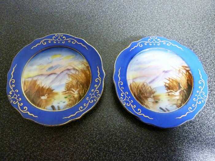Porselen duvar tabağı. 2 ad. Yüzeyi el boyaması manzara resimleriyle süslü. Kondisyonu süper. İki tabağın arkasında da askı aparatı mevcut. Ç:8 cm