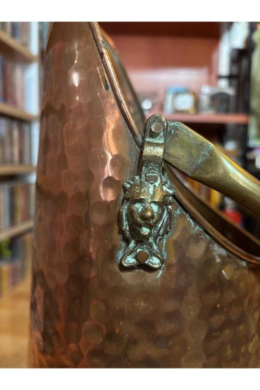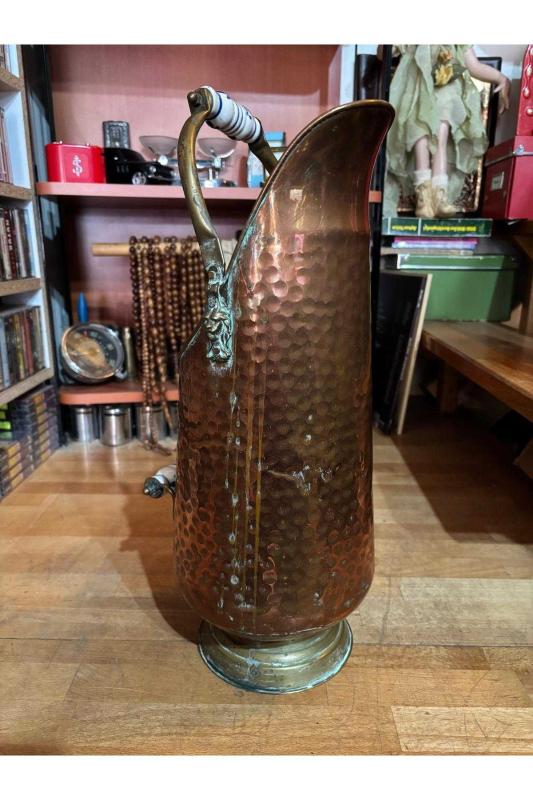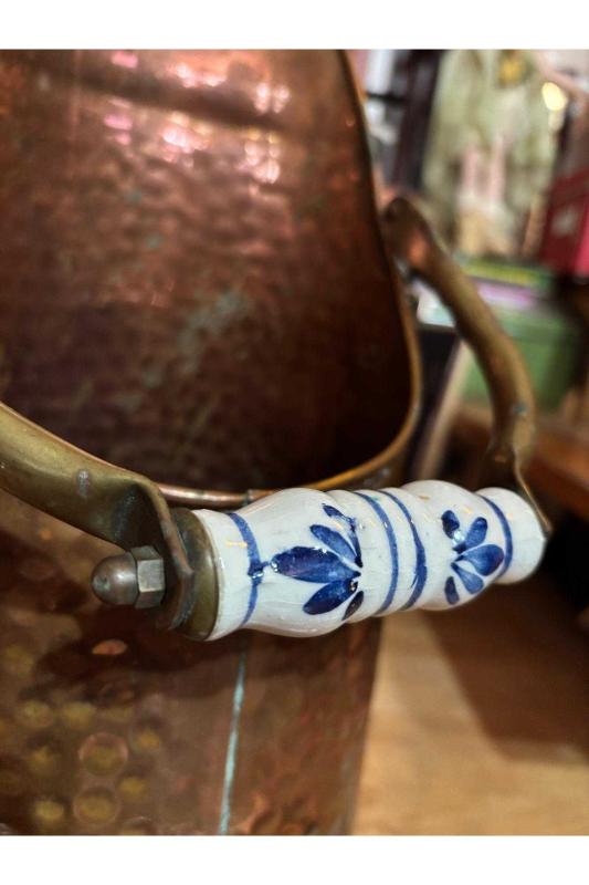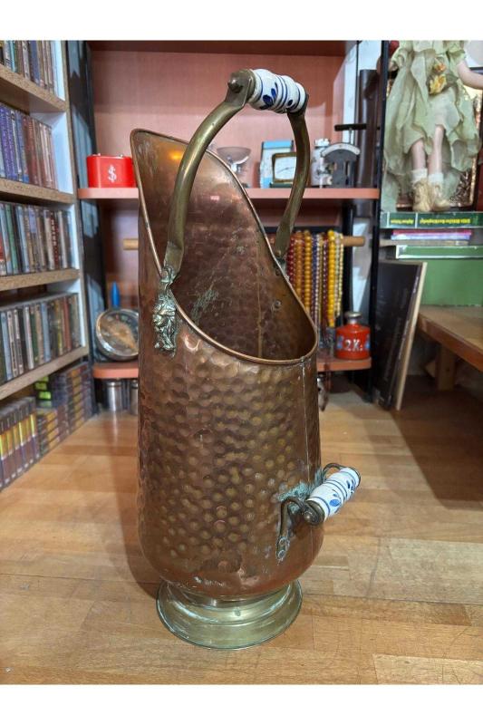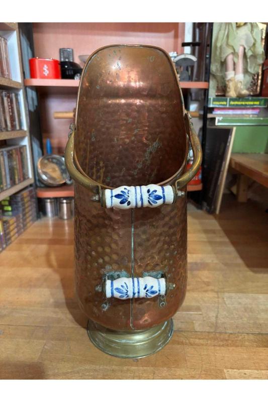 Porselen kulplu bakır kömür kovası 45 cm boyunda başlıklı antika/koleksiyon objesinin menşei belirtilmemiştir. Objenin ait olduğu dönem bilinmeketedir.