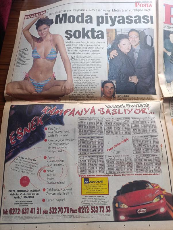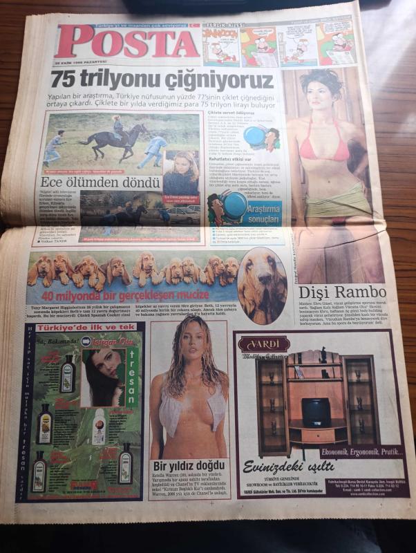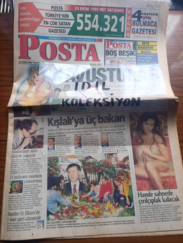 Posta Gazetesi - Turkish Newspaper - 25 Ekim 1999 - fatura ödenemediği için 1,5 Aydın hastane rehin tutulan bebek Adana valiliği araya girince serbest bırakıldı - Hande Ataizi sahnede çırılçıplak kalacak fotoğraf - Ahmet Taner Kışlalı suikasti için 3 bakan ekip oluşturdu - Ahmet Taner Kışlalı'nın bombalı suikasti uğradığı evinin önü ziyaretçi akınına uğruyor fotoğraf - Helin Avşar'a yeni aşık - Ebru Şallı'nın eski kaynanası Alev Esen yurtdışına kaçtı - Emel Müftüoğlu talk show yapacak - MHP'li Ceyhan Belediyesi başkan yardımcısı Alemdar Öztürk lise bastı - Merve Kavakçı olayında yargıya ağır müdahale - Süleyman Demirel Yıldırım Akbulut ve Bülent Ecevit Diyarbakır'da Barış hemen şimdi pankartıyla karşılandı fotoğraf - milenyum modası - at yarışı rehberi - futbol federasyonu Ve MHK'yi kınayan Fenerbahçe taraftarı Suadiye'den stada kadar yürüdü Fotoğrafı - Galatasaray takımı Berlin'e uçtu - Beşiktaşlı futbolcu Shorunmu sakat fotoğraf - Dişi Rambo Ebru Güzel fotoğraf - Estella Warren foto adlı eser, Kitap > Süreli Yayınlar > Gazeteler > Türkiye > Genel > Günlük kategorisinde İkinci El olarak satıştadır.
