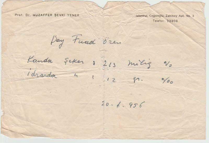 BELGE. Muzaffer şevki yener tarafından istenen tahlil sonucu. Kondisyon zayıf. 20 Haziran 1956. Cağaloğlu / İstanbul adresli. 20x14 cm.