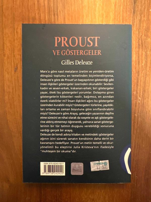 Proust ve Göstergeler / Gilles Deleuze, Gilles Deleuze tarafından kaleme alınmıştır. Eser Baskıya Haz: Mustafa Küpüşoğlu editörlüğünde hazırlanmıştır. Kitap 2004 yılında Kabalcı Yayınevi tarafından [İstanbul] 9758240927 ISBN kodu ile yayınlanmıştır. Bu baskının çevirisi Ayşe Meral tarafından yapılmıştır. 191 sayfadır. Proust ve Göstergeler / Gilles Deleuze adlı eser Türkçe dilindedir.