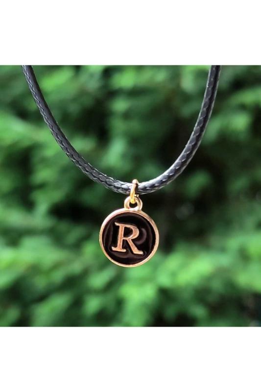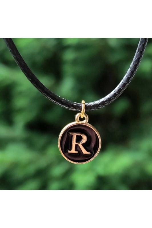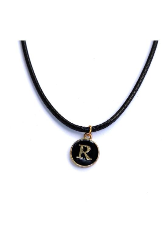 R Harfi Emaye Kaplı Mini Harf Kolye Altın Renk Siyah Zemin Solmaz Metal Alaşım