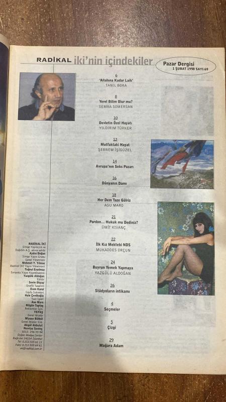 RADİKAL İKİ PAZAR DERGİSİ -1 ŞUBAT 1998 — SAYI:69 YAŞAR NURİ ÖZTÜRK - TANIL BORA - YILDIRIM TÜRKER - SEMRA SOMERSAN - GÜLRİZ SURURİ - ASU MARO - YAZGÜLÜ ALDOĞAN - ÜMİT KIVANÇ - ŞEBNEM İŞİGÜZEL - AYDIN DOĞAN - MEHMET Y. YILMAZ - TUĞRUL ERYILMAZ - SEVİN OKYAY - ESEN KAROL - HALE ÇEVİKOĞLU - NİLGÜN TOPTAŞ - MİYASE BÜLBÜL - AKGÜL AKBULUT - NEVRİYE SEVİNÇ - MUKADDES ORÇUN YAŞAR NURİ ÖZTÜRK VE TÜRK İSLAM PROTESTANLIĞI - DEVLETİN ÖZEL HAYATI - YEREL HUKUK YEREL BİLİM OLUR MU - HER DEM TAZE GÜLRİZ - MUTFAKTAKİ HAYAT - ALLAHINA KADAR LAİK - AVRUPA'NIN SEKS PAZARI - DÜNYANIN DAMI - PARDON HUKUK MU DEDİNİZ - İLK KIZ MEKTEBİ NDS - BUYRUN YEMEK YAPMAYA - STÜDYOLARIN İNTİKAMI - ÇİZGİ - SEÇMELER - MAĞARA ADAM - 32 SAYFA, AYDIN DOĞAN tarafından kaleme alınmıştır. Eser TUĞRUL ERYILMAZ editörlüğünde hazırlanmıştır. Kitap . tarafından [DOĞAN MEDYA CENTER] yayınlanmıştır. 32 sayfadır. RADİKAL İKİ PAZAR DERGİSİ -1 ŞUBAT 1998 — SAYI:69 YAŞAR NURİ ÖZTÜRK - TANIL BORA - YILDIRIM TÜRKER - SEMRA SOMERSAN - GÜLRİZ SURURİ - ASU MARO - YAZGÜLÜ ALDOĞAN - ÜMİT KIVANÇ - ŞEBNEM İŞİGÜZEL - AYDIN DOĞAN - MEHMET Y. YILMAZ - TUĞRUL ERYILMAZ - SEVİN OKYAY - ESEN KAROL - HALE ÇEVİKOĞLU - NİLGÜN TOPTAŞ - MİYASE BÜLBÜL - AKGÜL AKBULUT - NEVRİYE SEVİNÇ - MUKADDES ORÇUN YAŞAR NURİ ÖZTÜRK VE TÜRK İSLAM PROTESTANLIĞI - DEVLETİN ÖZEL HAYATI - YEREL HUKUK YEREL BİLİM OLUR MU - HER DEM TAZE GÜLRİZ - MUTFAKTAKİ HAYAT - ALLAHINA KADAR LAİK - AVRUPA'NIN SEKS PAZARI - DÜNYANIN DAMI - PARDON HUKUK MU DEDİNİZ - İLK KIZ MEKTEBİ NDS - BUYRUN YEMEK YAPMAYA - STÜDYOLARIN İNTİKAMI - ÇİZGİ - SEÇMELER - MAĞARA ADAM - 32 SAYFA adlı eser Türkçe dilindedir.