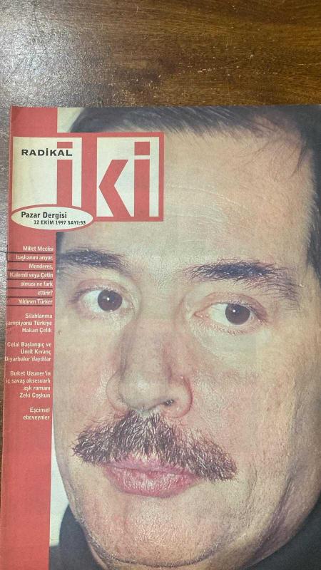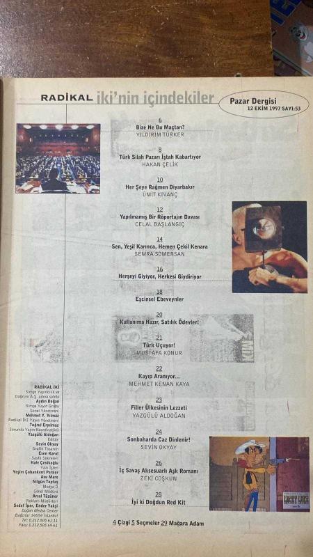 RADİKAL İKİ PAZAR DERGİSİ - 12 EKİM 1997 SAYI:53 YILDIRIM TÜRKER – HAKAN ÇELİK – ÜMİT KIVANÇ – CELAL BAŞLANGIÇ – SEMRA SOMERSAN – MUSTAFA KONUR – MEHMET KENAN KAYA – YAZGÜLÜ ALDOĞAN – SEVİN OKYAY – ZEKİ COŞKUN – BUKET UZUNER – AYDIN DOĞAN – MEHMET Y. YILMAZ – TUĞRUL ERYILMAZ – YAZGÜLÜ ALDOĞAN – ESEN KAROL – HALE ÇEVİKOĞLU – YEŞİM ÇOBANKENT – ASU MARO – NİLGÜN TOPTAŞ – ARSAL TÜZÜNER – SEDEF İPER – ENDER YAKŞİ MİLLET MECLİSİ BAŞKANINI ARIYOR – MENDERES, KALEMLİ VEYA ÇETİN OLMASI NE FARK ETTİRİR? – SİLAHLANMA ŞAMPİYONU TÜRKİYE – HER ŞEYE RAĞMEN DİYARBAKIR – İÇ SAVAŞ AKSESUARLI AŞK ROMANI – EŞCİNSEL EBEVEYNLER – BİZE NE BU MAÇTAN – TÜRK SİLAH PAZARI İŞTAH KABARTIYOR – YAPILMAMIŞ BİR RÖPORTAJIN DAVASI – SEN YEŞİL KARINCA HEMEN ÇEKİL KENARA – HERŞEYİ GİYİYOR HERKESİ GİYDİRİYOR – KULLANIMA HAZIR SATILIK ÖDEVLER – TÜRK UÇUYOR – KAYIP ARANIYOR – FİLLER ÜLKESİNİN LEZZETİ – SONBAHARDA CAZ DİNLENİR – İYİ Kİ DOĞDUN RED KİT – ÇİZGİ – SEÇMELER – MAĞARA ADAM - 32 SAYFA, AYDIN DOĞAN tarafından kaleme alınmıştır. Eser TUĞRUL ERYILMAZ editörlüğünde hazırlanmıştır. Kitap . tarafından [DOĞAN MEDYA CENTER] yayınlanmıştır. 32 sayfadır. RADİKAL İKİ PAZAR DERGİSİ - 12 EKİM 1997 SAYI:53 YILDIRIM TÜRKER – HAKAN ÇELİK – ÜMİT KIVANÇ – CELAL BAŞLANGIÇ – SEMRA SOMERSAN – MUSTAFA KONUR – MEHMET KENAN KAYA – YAZGÜLÜ ALDOĞAN – SEVİN OKYAY – ZEKİ COŞKUN – BUKET UZUNER – AYDIN DOĞAN – MEHMET Y. YILMAZ – TUĞRUL ERYILMAZ – YAZGÜLÜ ALDOĞAN – ESEN KAROL – HALE ÇEVİKOĞLU – YEŞİM ÇOBANKENT – ASU MARO – NİLGÜN TOPTAŞ – ARSAL TÜZÜNER – SEDEF İPER – ENDER YAKŞİ MİLLET MECLİSİ BAŞKANINI ARIYOR – MENDERES, KALEMLİ VEYA ÇETİN OLMASI NE FARK ETTİRİR? – SİLAHLANMA ŞAMPİYONU TÜRKİYE – HER ŞEYE RAĞMEN DİYARBAKIR – İÇ SAVAŞ AKSESUARLI AŞK ROMANI – EŞCİNSEL EBEVEYNLER – BİZE NE BU MAÇTAN – TÜRK SİLAH PAZARI İŞTAH KABARTIYOR – YAPILMAMIŞ BİR RÖPORTAJIN DAVASI – SEN YEŞİL KARINCA HEMEN ÇEKİL KENARA – HERŞEYİ GİYİYOR HERKESİ GİYDİRİYOR – KULLANIMA HAZIR SATILIK ÖDEVLER – TÜRK UÇUYOR – KAYIP ARANIYOR – FİLLER ÜLKESİNİN LEZZETİ – SONBAHARDA CAZ DİNLENİR – İYİ Kİ DOĞDUN RED KİT – ÇİZGİ – SEÇMELER – MAĞARA ADAM - 32 SAYFA adlı eser Türkçe dilindedir.
