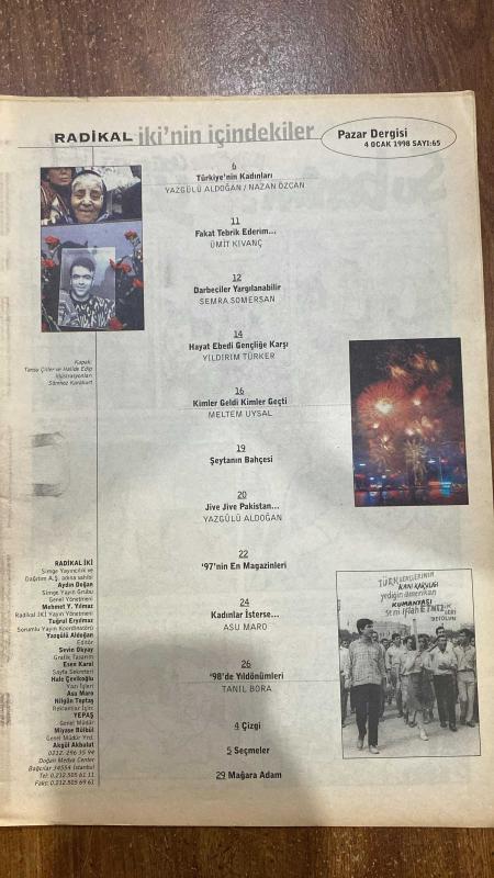 RADİKAL İKİ PAZAR DERGİSİ -4 OCAK 1998 - SAYI:65 YAZGÜLÜ ALDOĞAN - NAZAN ÖZCAN - ÜMİT KIVANÇ - SEMRA SOMERSAN - TANSU ÇİLLER - HALİDE EDİP - SÖNMEZ KARAKURT - YILDIRIM TÜRKER - MELTEM UYSAL - AYDIN DOĞAN - MEHMET Y. YILMAZ - TUĞRUL ERYILMAZ - SEVİN OKYAY - ESEN KAROL - HALE ÇEVİKOĞLU - ASU MARO - NİLGÜN TOPTAŞ - MİYASE BÜLBÜL - AKGÜL AKBULUT - ARSAL TÜZÜNER - SEDEF İPER - ENDER YAKŞİ - TANIL BORA TÜRKİYE’NİN KADINLARI - FAKAT TEBRİK EDERİM - DARBECİLER YARGILANABİLİR - HAYAT EBEDİ GENÇLİĞE KARŞI - KİMLER GELDİ KİMLER GEÇTİ - ŞEYTANIN BAHÇESİ - JIVE JIVE PAKİSTAN - '97’NİN EN MAGAZİNLERİ - KADINLAR İSTERSE - '98’DE YILDÖNÜMLERİ- 32 SAYFA, AYDIN DOĞAN tarafından kaleme alınmıştır. Eser TUĞRUL ERYILMAZ editörlüğünde hazırlanmıştır. Kitap . tarafından [DOĞAN MEDYA CENTER] yayınlanmıştır. 32 sayfadır. RADİKAL İKİ PAZAR DERGİSİ -4 OCAK 1998 - SAYI:65 YAZGÜLÜ ALDOĞAN - NAZAN ÖZCAN - ÜMİT KIVANÇ - SEMRA SOMERSAN - TANSU ÇİLLER - HALİDE EDİP - SÖNMEZ KARAKURT - YILDIRIM TÜRKER - MELTEM UYSAL - AYDIN DOĞAN - MEHMET Y. YILMAZ - TUĞRUL ERYILMAZ - SEVİN OKYAY - ESEN KAROL - HALE ÇEVİKOĞLU - ASU MARO - NİLGÜN TOPTAŞ - MİYASE BÜLBÜL - AKGÜL AKBULUT - ARSAL TÜZÜNER - SEDEF İPER - ENDER YAKŞİ - TANIL BORA TÜRKİYE’NİN KADINLARI - FAKAT TEBRİK EDERİM - DARBECİLER YARGILANABİLİR - HAYAT EBEDİ GENÇLİĞE KARŞI - KİMLER GELDİ KİMLER GEÇTİ - ŞEYTANIN BAHÇESİ - JIVE JIVE PAKİSTAN - '97’NİN EN MAGAZİNLERİ - KADINLAR İSTERSE - '98’DE YILDÖNÜMLERİ- 32 SAYFA adlı eser Türkçe dilindedir.