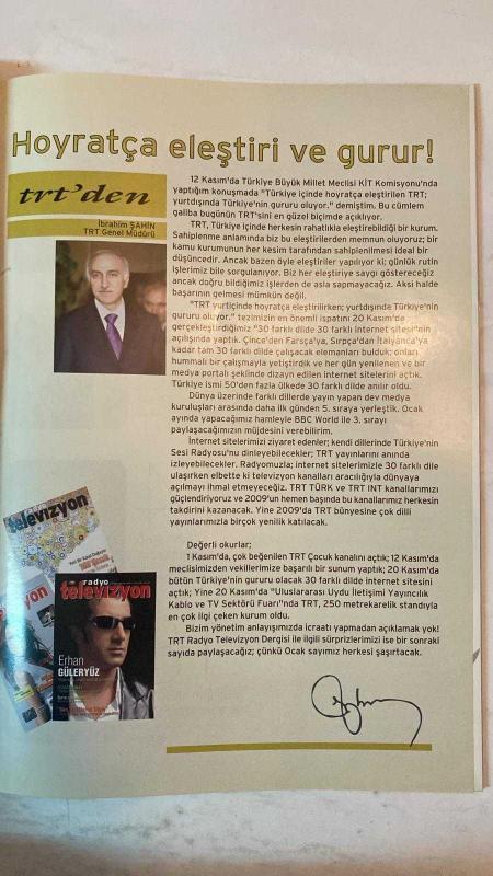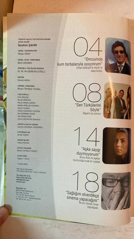 RADYO TELEVİZYON AYLIK HABER YAYIN DERGİSİ - ARALIK 2008 SAYI: 235 ERHAN GÜLERYÜZ – OSMAN SINAV – HANDE SUBAŞI – KADİR ÇÖPDEMİR – ÖZGÜR EREN – MİTHAT SANCAR – SEDEF KABAŞ – SÜLEYMAN BELEDİOĞLU – BURCU KARADAĞ – BURCU KARA – EFKAN BEYAZ – GÜVEN AKSU – BİRSEN TAYMAZ YÜKSEL ERHAN GÜLERYÜZ: “OMZUMDA KUM TORBALARIYLA UYUYORUM” – “SEN TÜRKÜLERİNİ SÖYLE”: BAŞARILI ÜÇ SUNUCUYLA – BURCU KARA: “AŞKA SAYGI DUYMUYORUM” – OSMAN SINAV: “SAĞLIĞIM ELVERDİKÇE SİNEMA YAPACAĞIM” – SURRE-İ HÜMAYUN: BEŞ ASIRLIK KÖKLÜ BİR GELENEK – BİR DARGIN BİR BARIŞIK: 200 YILLIK TÜRK-AMERİKAN İLİŞKİLERİ – MİTHAT SANCAR: “TÜRKİYE TİPİ DEĞİL, EVRENSEL DEMOKRASİ” – “HİÇBİR ŞEY BİLDİĞİNİZ GİBİ DEĞİL”: TARİH EZBERE GELMEZ – SEDEF KABAŞ: EN KESKİN SORULARA NEZAKET TÖRPÜSÜ – SÜLEYMAN BELEDİOĞLU İLE “EĞİTİM ŞART” – TRT-WORLD.COM: 30 DİLDE İNTERNET YAYINI – BURCU KARADAĞ: “NEY VÜCUDUMUN BİR PARÇASI” – TRT BELGESEL FİLM YARIŞMASI BAŞVURULARI DEVAM EDİYOR – 10 BİN ORKİDESİ VAR: ORKİDE SEVDALISI BİR HA - TAM TAKIM EKSİKSİZ 74 SAYFA, MUSTAFA ÇEVİK tarafından kaleme alınmıştır. Eser AYNUR ÇELİKCAN editörlüğünde hazırlanmıştır. Kitap . tarafından yayınlanmıştır. 74 sayfadır. RADYO TELEVİZYON AYLIK HABER YAYIN DERGİSİ - ARALIK 2008 SAYI: 235 ERHAN GÜLERYÜZ – OSMAN SINAV – HANDE SUBAŞI – KADİR ÇÖPDEMİR – ÖZGÜR EREN – MİTHAT SANCAR – SEDEF KABAŞ – SÜLEYMAN BELEDİOĞLU – BURCU KARADAĞ – BURCU KARA – EFKAN BEYAZ – GÜVEN AKSU – BİRSEN TAYMAZ YÜKSEL ERHAN GÜLERYÜZ: “OMZUMDA KUM TORBALARIYLA UYUYORUM” – “SEN TÜRKÜLERİNİ SÖYLE”: BAŞARILI ÜÇ SUNUCUYLA – BURCU KARA: “AŞKA SAYGI DUYMUYORUM” – OSMAN SINAV: “SAĞLIĞIM ELVERDİKÇE SİNEMA YAPACAĞIM” – SURRE-İ HÜMAYUN: BEŞ ASIRLIK KÖKLÜ BİR GELENEK – BİR DARGIN BİR BARIŞIK: 200 YILLIK TÜRK-AMERİKAN İLİŞKİLERİ – MİTHAT SANCAR: “TÜRKİYE TİPİ DEĞİL, EVRENSEL DEMOKRASİ” – “HİÇBİR ŞEY BİLDİĞİNİZ GİBİ DEĞİL”: TARİH EZBERE GELMEZ – SEDEF KABAŞ: EN KESKİN SORULARA NEZAKET TÖRPÜSÜ – SÜLEYMAN BELEDİOĞLU İLE “EĞİTİM ŞART” – TRT-WORLD.COM: 30 DİLDE İNTERNET YAYINI – BURCU KARADAĞ: “NEY VÜCUDUMUN BİR PARÇASI” – TRT BELGESEL FİLM YARIŞMASI BAŞVURULARI DEVAM EDİYOR – 10 BİN ORKİDESİ VAR: ORKİDE SEVDALISI BİR HA - TAM TAKIM EKSİKSİZ 74 SAYFA adlı eser Türkçe dilindedir.