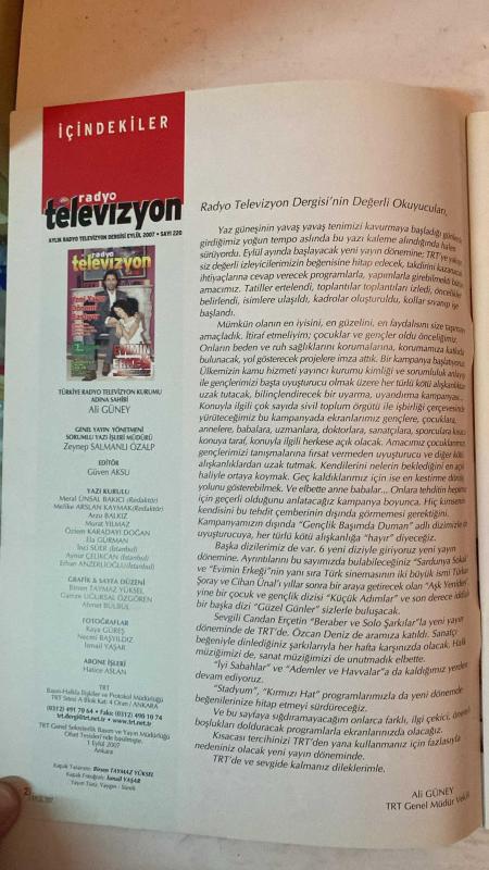 RADYO TELEVİZYON AYLIK HABER YAYIN DERGİSİ - EYLÜL 2007 SAYI: 220 SELCUK YÖNTEM – JANSET – MUSTAFA UĞURLU – TÜRKAN ŞORAY – CİHAN ÜNAL – CANDAN ERÇETİN – ÖZCAN DENİZ – ÜMİT TOKCAN – ÜSTÜN DÖKMEN – GÜVEN AKSU – MELİKE ARSLAN KAYMAK – ALİ GÜNEY YENİ YAYIN DÖNEMİ BAŞLIYOR: KALİTELİ DİZİLER, İDDİALI BELGESELLER, TARAFSIZ HABER, SPOR, MÜZİK, EĞLENCE – “GENÇLİK BAŞIMDA DUMAN” DİZİSİYLE UYUŞTURUCUYA HAYIR – “SARDUNYA SOKAK”: SELÇUK YÖNTEM İLE SICACIK BİR AİLE DİZİSİ – “EVİMİN ERKEĞİ”: JANSET VE MUSTAFA UĞURLU İLE KAHKAHA TUFANI – “AŞK YENİDEN”: TÜRKAN ŞORAY VE CİHAN ÜNAL YILLAR SONRA BİR ARADA – “KÜÇÜK ADIMLAR” VE “GÜZEL GÜNLER”: GENÇLİK VE AİLE DİZİLERİ – CANDAN ERÇETİN “BERABER VE SOLO ŞARKILAR”LA TRT’DE – ÖZCAN DENİZ’DEN MÜZİK PROGRAMI – “İYİ SABAHLAR” VE “ADEMLER VE HAVVALAR” DEVAM EDİYOR – “STADYUM” VE “KIRMIZI HAT” YENİDEN EKRANDA – RAMAZAN: ON BİR AY BEKLENEN RAHMET VE SEVGİ AYI – “DEV KANATLAR”: ÖDÜLDEN ÖDÜLE UÇUYOR – “BİR TATLI HUZUR”: ÜMİT TOKCAN’LA HOŞ - TAM TAKIM EKSİKSİZ 74 SAYFA adlı eser, Kitap > Süreli Yayınlar > Dergiler > Magazin, Moda kategorisinde İkinci El olarak satıştadır.