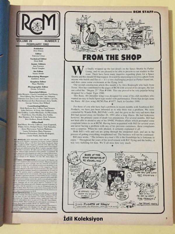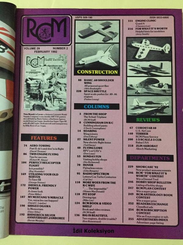 RC Modeler Radio Control Airplanes Flying Electrical - February 1992 - Vintage Magazine - İngilizce Uzaktan Kumandalı Model Uçak Dergisi - Construction : Basic 60 Shoulder Wing - Space Shuttle - Corostar 40 - Zlin Akrobat - J3 CUB