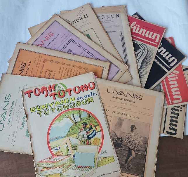 Servet-i Fünun 1891-1944 arasında aralıklarla 2461 sayı yayımlandı. D. Nikolaidi’nin sahibi olduğu Servet gazetesinin fen eki olarak Ahmet İhsan tarafından yayımlanmaya başlayan Servet-i Fünûn’un ilk sayısı 27 Mart 1891’de çıkar. Latin harflerinin kabulü ile adını Serveti Fünun Uyanış olarak değiştiren derginin yazı işleri müdürlüğüne Mahmut Sadık, daha sonra da Halit Fahri getirilir. Dönemin farklı edebiyat anlayışlarına sahip ediplerinin eserlerine yer veren dergi 29 Aralık 1942’de Ahmet İhsan’ın ölümüne rağmen aralıksız çıkmaya devam eder ve yayın hayatına 25 Mayıs 1944’te çıkarılan 2461. sayısı ile veda eder. Ahmet İhsan tarafından kurulan ve kullandığı çağdaş teknikler ve yetiştirdiği baskı ustaları ile Türk matbaacılığında önemli bir yere sahip Servet-i Fünun Matbaası’nda basılmıştır. MEVCUT SAYILAR: 1930: 84, 1931: 109, 125, 126, 133, 1933: 222, 1944: 2451, 2452, 2453, 2454. Bir sayı içinde; TÜRK TÜTÜNÜ DÜNYANIN EN NEFİS TÜTÜNÜDÜR, renkli tam sayfa reklam. Metin eksiği, kopuğu yok, temiz bir takım. LOT HALİNDE SATILIR, TEK TEK SATILMAZ.