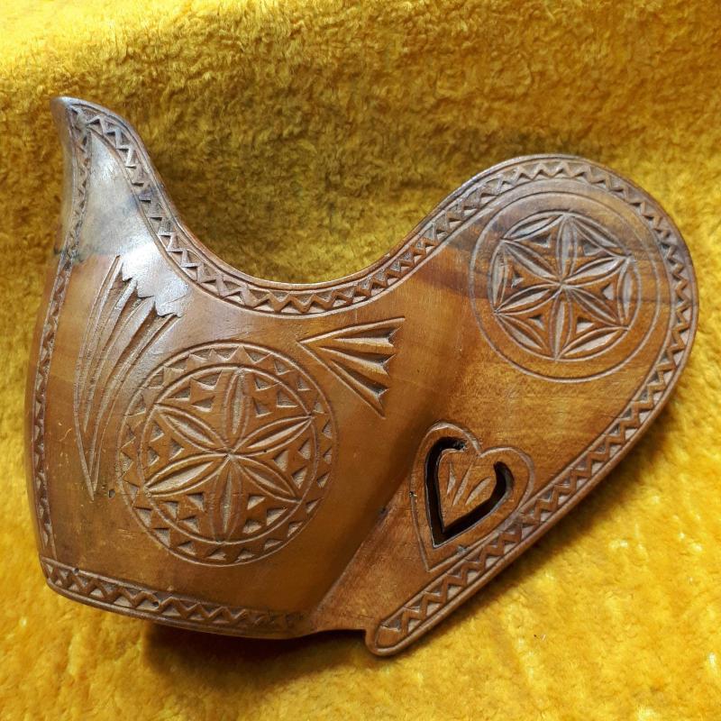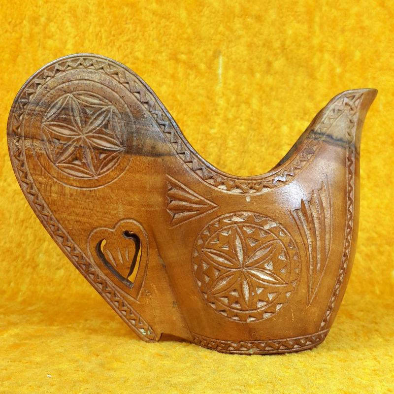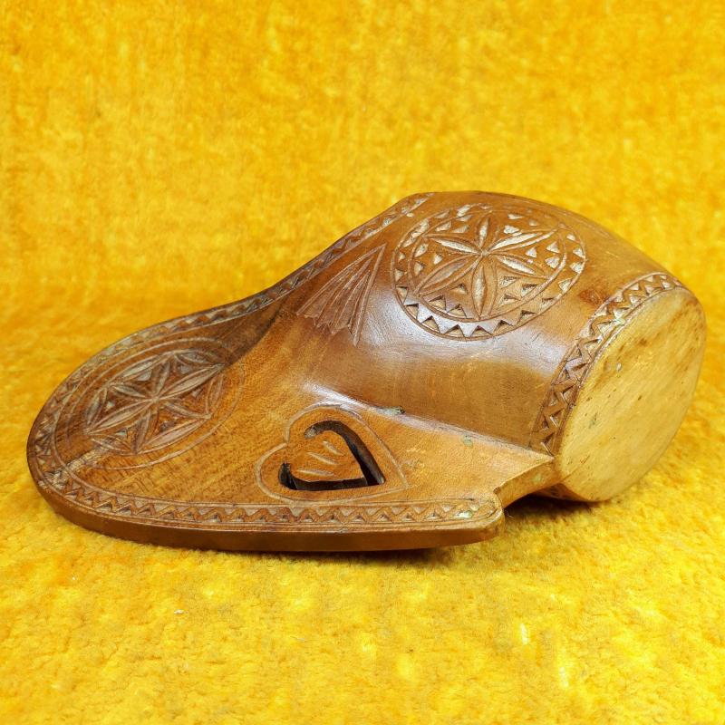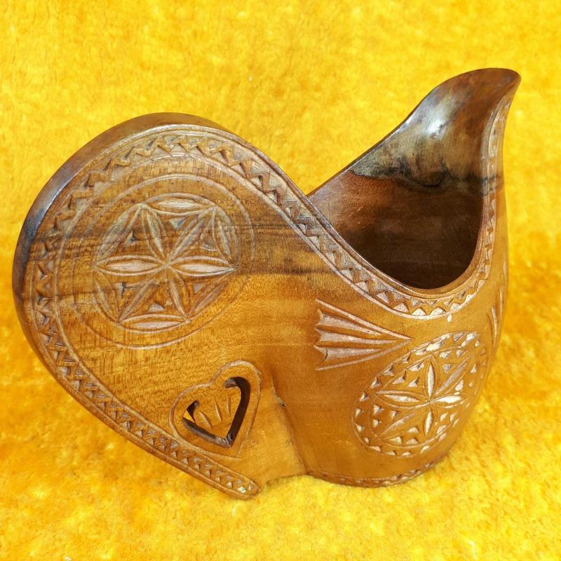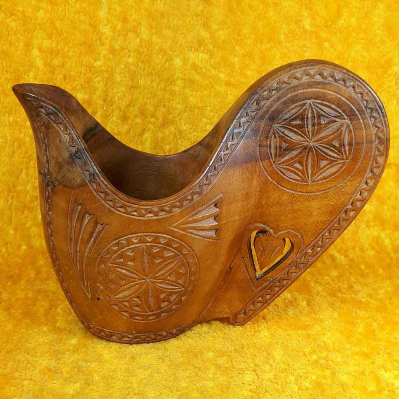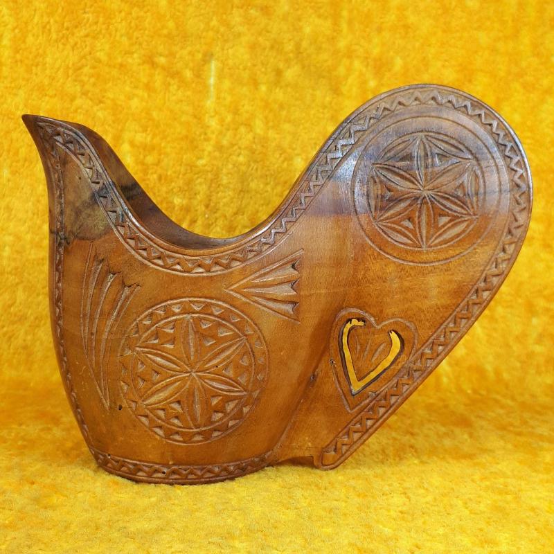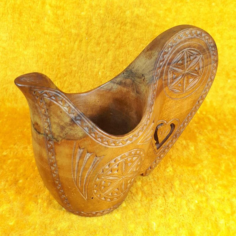 1960 LARDAN . YEKPARE AĞAÇTAN EL OYMA . YÜKSEKLİK 11 cm , GAGAYLA KULP ARASI EN FAZLA 14 cm . KALP VE STİLİZE ÇİÇEKLER DESENLİ . KUSURSUZ .
