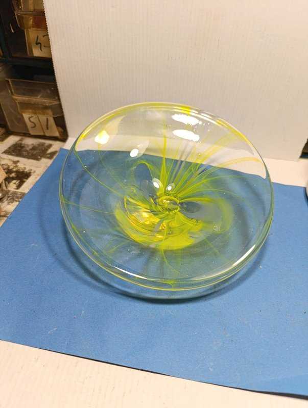 RF28---EĞİK EL YAPIMI SEHPA MASA SÜSÜ CAM KASE başlıklı antika/koleksiyon objesinin menşei belirtilmemiştir. Objenin ait olduğu dönem bilinmeketedir.