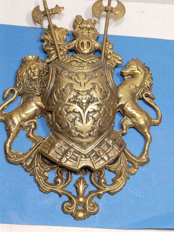 RF28---PİRİNÇ DÖKÜM AT,ASLAN VE ZIRH DEKORLU DUVAR SÜSÜ başlıklı antika/koleksiyon objesinin menşei belirtilmemiştir. Objenin ait olduğu dönem bilinmeketedir.