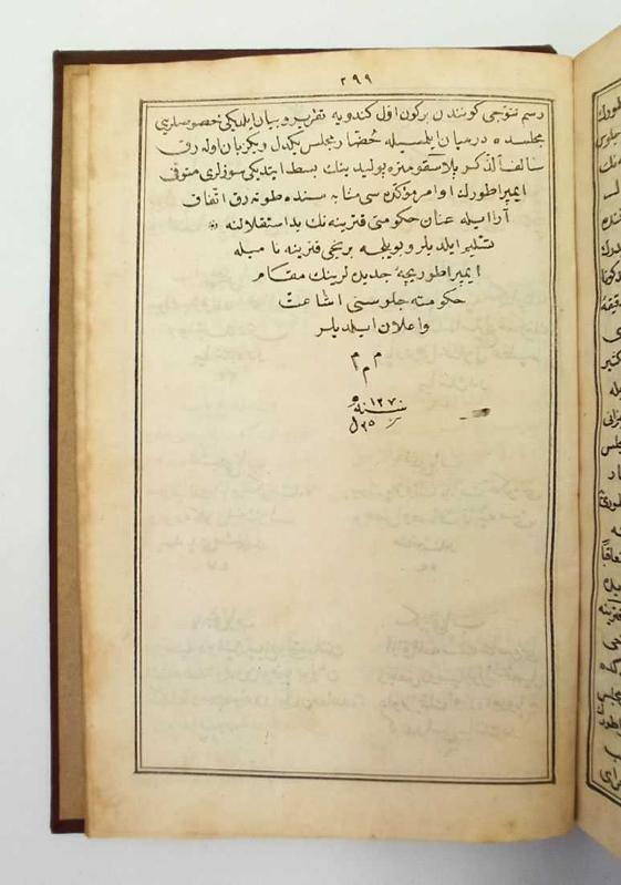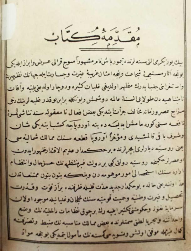 [RUSYA / ÇAR BÜYÜK PETRO] Büyük Petro'nun eyyâm-ı hükümetinde Rusya'da cereyân eden ahvâl-i dahiliyye ve umûr-i hâriciyyeye ve husûsiyle nizâmât-ı mevzûa-i cedîdeye ve oralarda bulunan milel ve akvâm-ı muhtelifenin ahlâk ve âdâb ve fünûn ve sanâyilerine dair Büyük Petro'nun kızı Elizabete'nin kurenâsından Şovalef nâm zâtın bazı resâil-i mevsûka ve senedât-ı sahîhadan vukûf ve ittılâi hâsıl olan ahvâl ve keyfiyâtı nakil ve hikâyeye mübâşeret olunmuştur, IVAN IVANOVICH SHUVALOV, (1727-1797) tarafından kaleme alınmıştır. Kitap 1854 yılında Yeni Matbaa tarafından [İstanbul] yayınlanmıştır. 305 sayfadır. Sayfa bilgisi 305 olarak belirtilmiştir. [RUSYA / ÇAR BÜYÜK PETRO] Büyük Petro'nun eyyâm-ı hükümetinde Rusya'da cereyân eden ahvâl-i dahiliyye ve umûr-i hâriciyyeye ve husûsiyle nizâmât-ı mevzûa-i cedîdeye ve oralarda bulunan milel ve akvâm-ı muhtelifenin ahlâk ve âdâb ve fünûn ve sanâyilerine dair Büyük Petro'nun kızı Elizabete'nin kurenâsından Şovalef nâm zâtın bazı resâil-i mevsûka ve senedât-ı sahîhadan vukûf ve ittılâi hâsıl olan ahvâl ve keyfiyâtı nakil ve hikâyeye mübâşeret olunmuştur adlı eser Osmanlıca dilindedir.