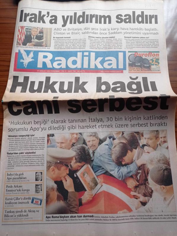 Radikal Gazetesi - 17 Aralık 1998 - Polisiye Ve Dedektif Romanlarının Yazarı Agatha Christie - Haydar Ergülen - Tuncay Özkan - İsmet Berkan - İtalya'yla Gizli Apo Pazarlıkları - Tansu Çiller'e Dörtlü Koalisyon Önerilecek - İtalya 30 Bin Kişinin Katili Abdullah Öcalan'ı Serbest Bıraktı - Saddam Hüseyin - Tony Blair adlı eser Türkçe dilindedir.