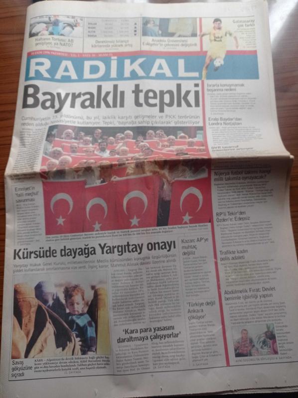 Radikal Gazetesi - 28 Ekim 1996 - Fenerbahçe'nin Yeni Hedefi Manchester United - Galatasaray Çok Farklı - Hakan Şükür - Yol Filmi - Cumhuriyetin 73. Yıldönümünde Bayraklı Tepki - Refah Partili Devlet Bakanı Sabri Tekir'den Yekta Güngör Özden'e Edepsiz Suçlaması - Abdülmelik Fırat Devlet Benimle İşbirliği Yapsın - Adalet Bakanı Şevket Kazan Avrupa Parlamentosu'na Muhtaç Değiliz - Anadolu Üniversitesi Eskişehir'in Çehresini Değiştirdi adlı eser, Kitap > Süreli Yayınlar > Gazeteler kategorisinde İkinci El olarak satıştadır.