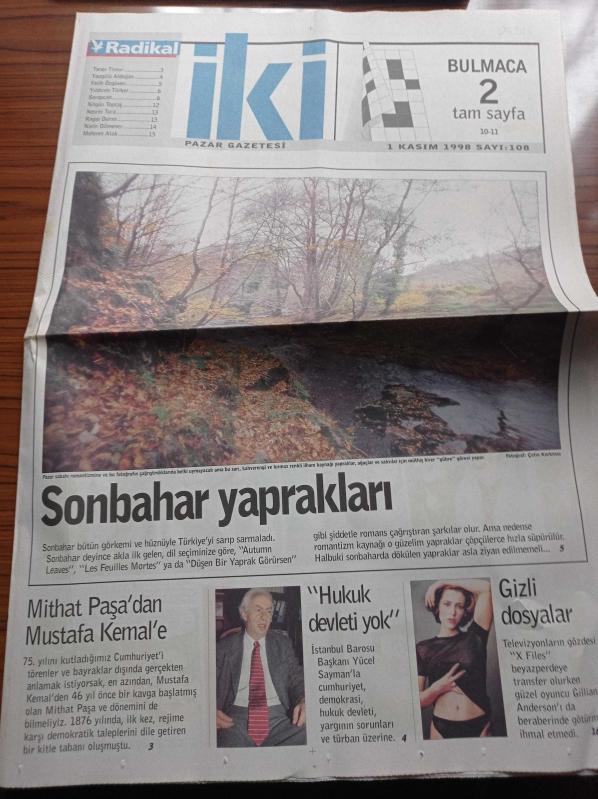 Radikal İki Gazetesi - 1 Kasım 1998 - Atilla Taş'la Peynirli Günler - Yeşim 70'li Yıllarda Türk Popu'na Sağlam Bir Giriş Yapmıştı - Oksijen Sarısı - Cahide Sonku - Leyla Sayar - Suzan Avcı - Neriman Köksal - İstanbul Barosu Başkanı Yücel Sayman Hukuk Devleti Yok - Mithatpaşa'dan Mustafa Kemal'e - Gizli Dosyalar - Yazgülü Aldoğan - Nesrin Tura - Ragıp Duran - Yıldırım Türker adlı eser Türkçe dilindedir.
