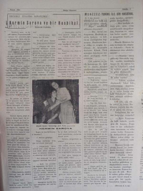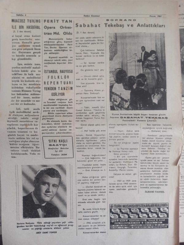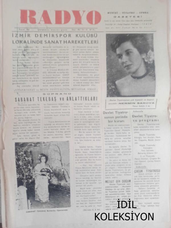 Radyo Gazetesi Musiki Tiyatro ve Opera Dergisi - 1 Kasım 1961 - İzmir Demirspor Kulübü Lokalinde Sanat Hareketleri - Nermin Sarova - Soprano Sabahat Tekebaş ve Anlattıkları - Ankara'da Çocuk Tiyatrosu - Mesut Bir Doğum - Halk Musikisinin Sevilen Sanatçııs: Muazzez Turing ile Bir Hasbihal - Arif Sami Toker - Ferit Tan Opera Orkestrası Md. Oldu - İstanbul Radyosu Folklör Repertuarı Yeniden Tanzim Ediliyor - Sabahat Tekebaş ve Anlattıkları - Türk Musikisi Bestekarları Külliyatı fotoğraf ve haberi - Tam Takım Dergi Yıpranma, sararmalar, kupon kesiği ve yırtılmalar zamana bağlı olarak görülebilir