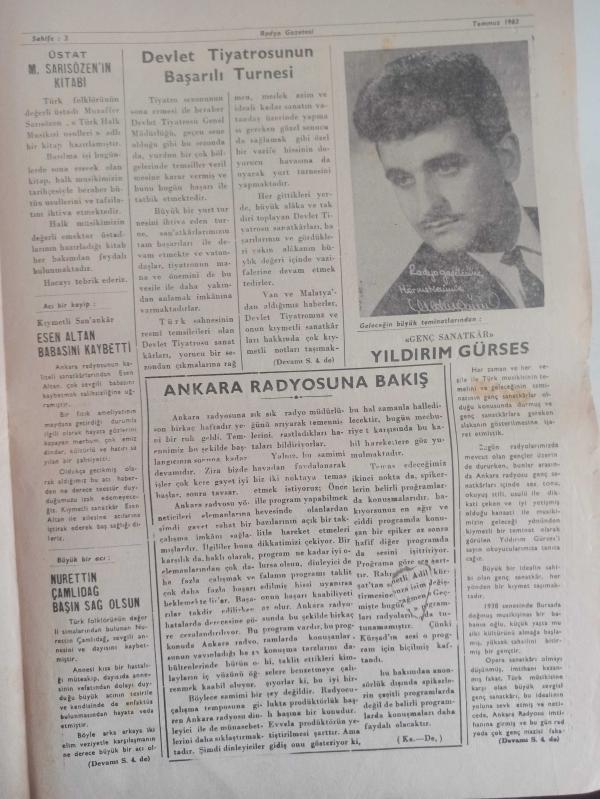 Radyo Gazetesi Musiki Tiyatro ve Opera Dergisi - 25 Temmuz 1962 - Sanatkarlar Danıştaya Baş Vuracaklar - Sevda Aydan Bulgaristan ve İtalya'ya Gidiyor - Devlet Konservatuarında Milli Oyunlar - Değerli Bariton: Özcan Sevgen İtalya'ya Gitti - Folklör Yıldızları Şahinler Odeon Plaklarında - Türkiye'de Radyo - Halk Oyunları ve Halk Türküleri Federasyonu - Mikrofon Arkası - Mefharet Atalay Ankara'da - Musiki ve Müneccimlik - Hüseyin Sadettin Arel - Üstat Muzaffer Sarısözen'in Kitabı - Esen Altan Babasını Kaybetti - Nurettin Çamlıdağ Başın Sağ Olsun - Devlet Tiyatrosunun Başarılı Turnesi - Ankara Radyosuna Bakış - Genç Sanatkar Yıldırım Gürses - Yıldırım Gürses - Nurettin Çamlıdağ Başın Sağ Olsun - Piyano Üzerine Fıkralar - Beyhan Akını - Sıtkı Kaşlı Saatçi - Moda Terzihanesi - Neriman Minareci fotoğraf ve haberi - Tam Takım Dergi Yıpranma, sararmalar, kupon kesiği ve yırtılmalar zamana bağlı olarak görülebilir