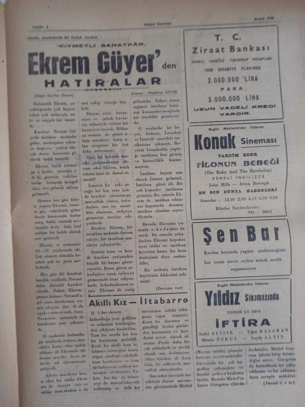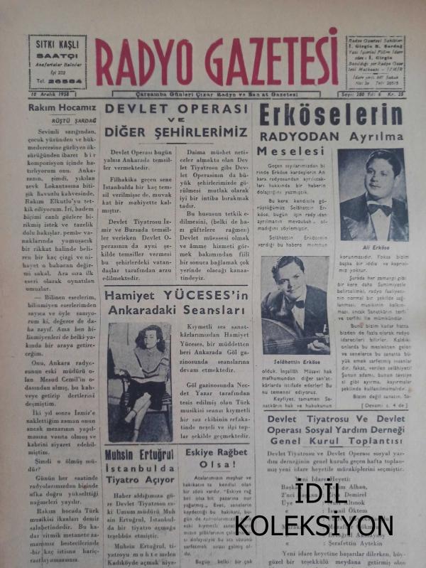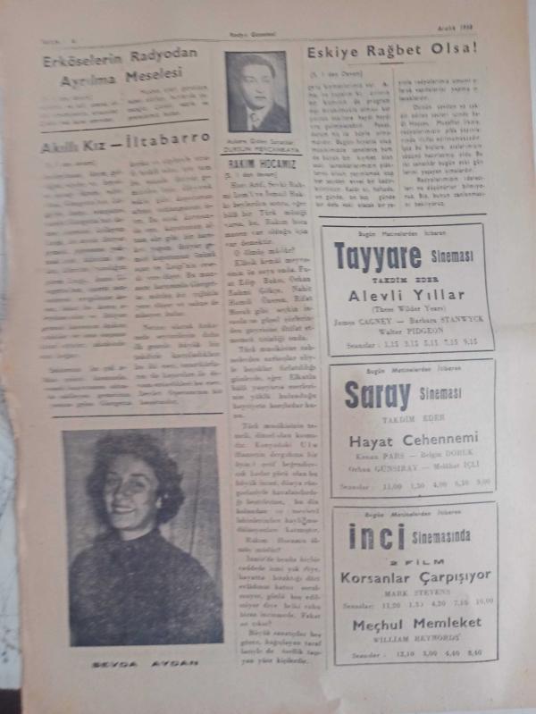 Radyo Gazetesi Siyasi Radyo ve Sanat Dergisi - 10 Aralık 1958 - Rüştü Şardağ - Devlet Operası ve Diğer Şehirlerimiz - Erköselerin Radyodan Ayrılma Meselesi - Hamiyet Yüceses'in Ankara'daki Seansları - Ali Erköse - Selahattin Erköse - Muhsin Ertuğrul İstanbul'da Tiyatro Açıyor - Eskiye Rağbet Olsa! - Devlet Tiyatrosu ve Devlet Operası Sosyal Yardım Derneği Genel Kurul Toplantısı - Lüksemburg'da Neler Gördüm? - İlhami Tansel - Akıllı Kız İltibarro - Sevda Aydan - Doğan Onat - Ekrem Güyer'den Hatıralar - Ziraat Bankası Reklamı - Konak Sineması - Şen Bar - Yıldız Sineması - Eskiye Rağbet Olsa! - Sevda Aydan - Tayyare Sineması - Saray Sineması - İnci Sineması fotoğraf ve haberi - Tam Takım Dergi Yıpranma, sararmalar, kupon kesiği ve yırtılmalar zamana bağlı olarak görülebilir
