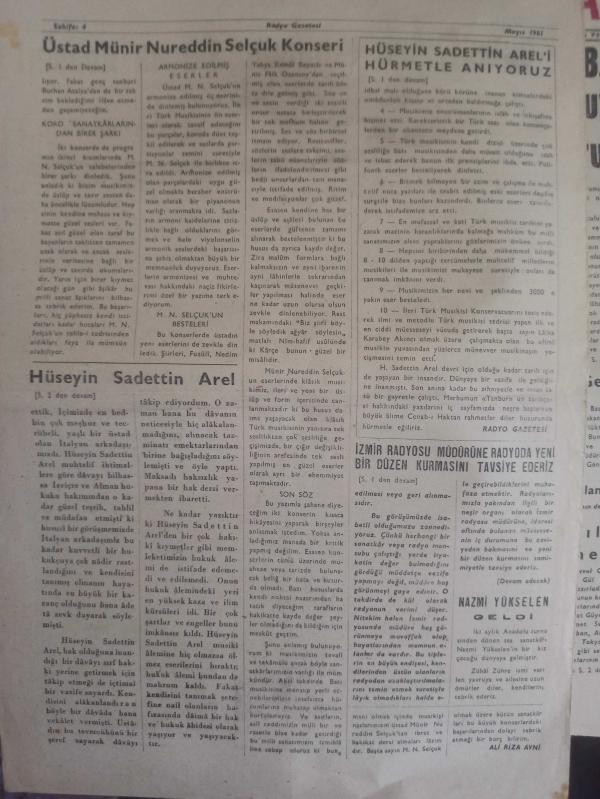 Radyo Gazetesi Siyasi Radyo ve Sanat Dergisi - 10 Mayıs 1961 - İzmir Radyosu Müdürüne Radyoda Yeni Bir Düzen Kurmasını Tavsiye Ederiz - Hüseyin Sadettin Arel'i Hürmetle Anıyoruz - Üstad Münir Nurettin Selçuk'un Şehrimizdeki Konserleri Büyük Bir Sanat Hadisesi ldu - İzmir Türk Musikisi Cemiyetinin Konseri - Muzaffer Etabek - Bazı Türk Sazları Hakkında Tetkikler Tanbur - Hüseyin Sadettin Arel - Emin Ongan - Vecihe Daryal - Veci Seyhun - Burhan Atalay - Nazmi Yükselen Geldi - Ali Rıza Avni fotoğraf ve haberi - Tam Takım Dergi, İ. Girgin tarafından kaleme alınmıştır. Kitap 1961 yılında Radyo Gazetesi Matbaası tarafından [İzmir] yayınlanmıştır. 4 sayfadır. Radyo Gazetesi Siyasi Radyo ve Sanat Dergisi - 10 Mayıs 1961 - İzmir Radyosu Müdürüne Radyoda Yeni Bir Düzen Kurmasını Tavsiye Ederiz - Hüseyin Sadettin Arel'i Hürmetle Anıyoruz - Üstad Münir Nurettin Selçuk'un Şehrimizdeki Konserleri Büyük Bir Sanat Hadisesi ldu - İzmir Türk Musikisi Cemiyetinin Konseri - Muzaffer Etabek - Bazı Türk Sazları Hakkında Tetkikler Tanbur - Hüseyin Sadettin Arel - Emin Ongan - Vecihe Daryal - Veci Seyhun - Burhan Atalay - Nazmi Yükselen Geldi - Ali Rıza Avni fotoğraf ve haberi - Tam Takım Dergi adlı eser Türkçe dilindedir.