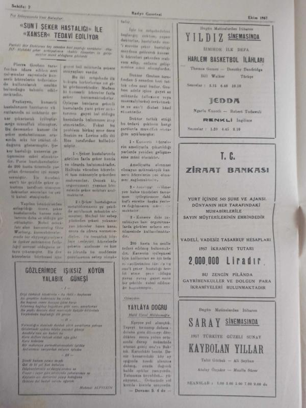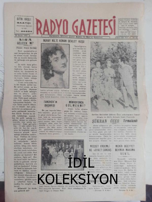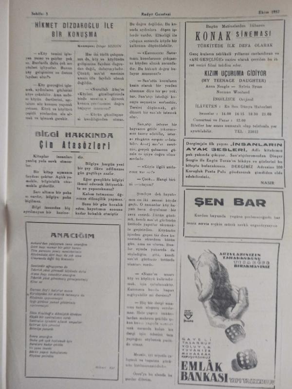 Radyo Gazetesi Siyasi Radyo ve Sanat Dergisi - 11 Aralık 1957 - Perihan Sözeri'yi Dinlerken - Rüştü Şardağ Şehrimiz Adına Mevlana İhtifaline Gidiyor - Yeni Umum Müdürden Beklediklerimiz - Münis Faik Ozansoy - Zehra Eren - Türkçe Tangoların Sevilen Solisti - Aşk Susamışlardı - Sevim Tın - Ziraat Bankası Reklamı - Lejyon Dönüşü Filmi - Sissi Filmi - Hasan Tahsin Önder - Emlak Bankası Reklamı - Sonsuz Izdırap - Hazreti-i Muhammed'in Yegani Varisi Hazret-i Mevlana - İnsaniyet Zinciri - Sümerbank Reklamı - Adsız Kahramanlar - Ormanlar Mabudesi fotoğraf ve haberi - Tam Takım Dergi Yıpranma, sararmalar, kupon kesiği ve yırtılmalar zamana bağlı olarak görülebilir