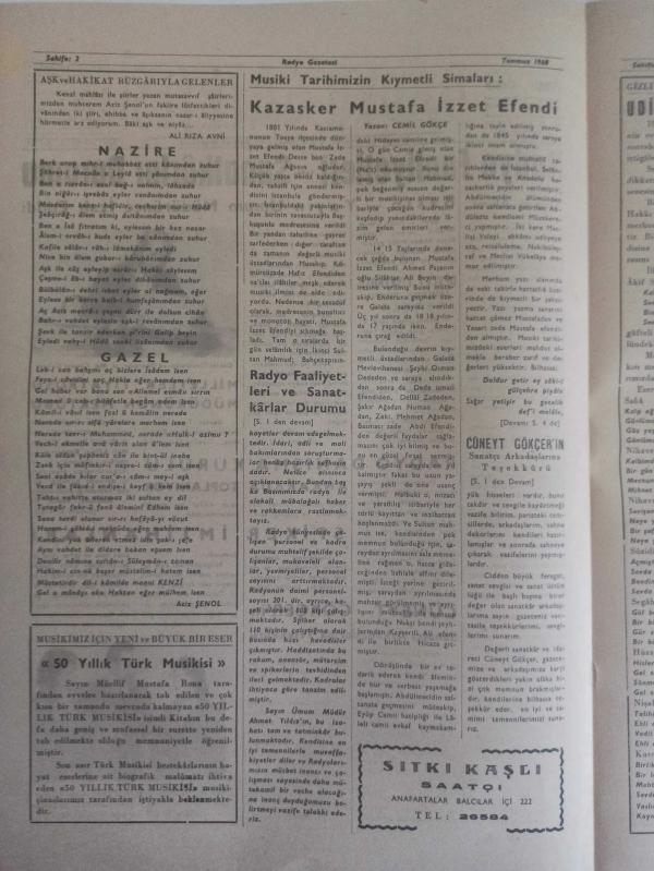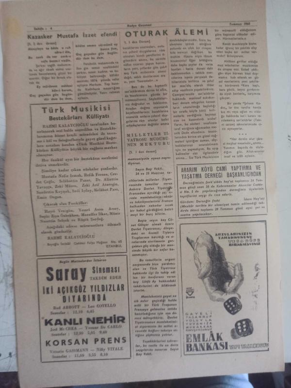 Radyo Gazetesi Siyasi Radyo ve Sanat Dergisi - 13 Temmuz 1960 - Radyo Faaliyetleri ve Sanatkarlar Durumu Basın Yayın Umum Müdürünce İzah Edildi - Oturak Alemi - Ali Rıza Avni - Devlet Tiyatrosu İzmir'de Temsil Verecek - Milletler Tiyatrosu Müdürünün Mektubu - Radyo Danışma Kurulu Ankara'da Toplanıyor - Spiker İmtihanları - Cüneyt Gökçer'in Sanatçı Arkadaşlarına Teşekkür - Nazire - Gazel - 50 Yıllık Türk Musikisi - Kazasker Mustafa İzzet Efendi - Cemil Gökçe - Radyo Faaliyetleri ve Sanatkarlar Durumu - Cüneyt Gökçer'in Sanatçı Arkadaşlarına Teşekkürü - Udi Osman Çakıroğlu - Devlet Tiyarosunun Başarısı - İlhami Tansel - Oturak Alemi - Milletler Tiyatrosu Müdürünün Mektubu - Ararım Köyü Cami Yaptırma ve Yaşatma Derneği Başkanlığından - Saray Sineması - Kanlı Nehir Filmi - Emlak Bankası Reklamı fotoğraf ve haberi - Tam Takım Dergi Yıpranma, sararmalar, kupon kesiği ve yırtılmalar zamana bağlı olarak görülebilir