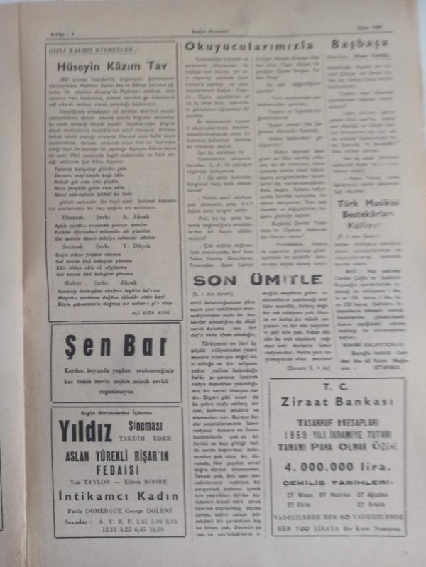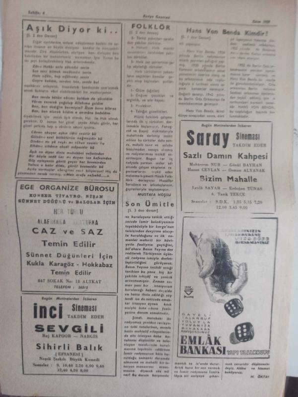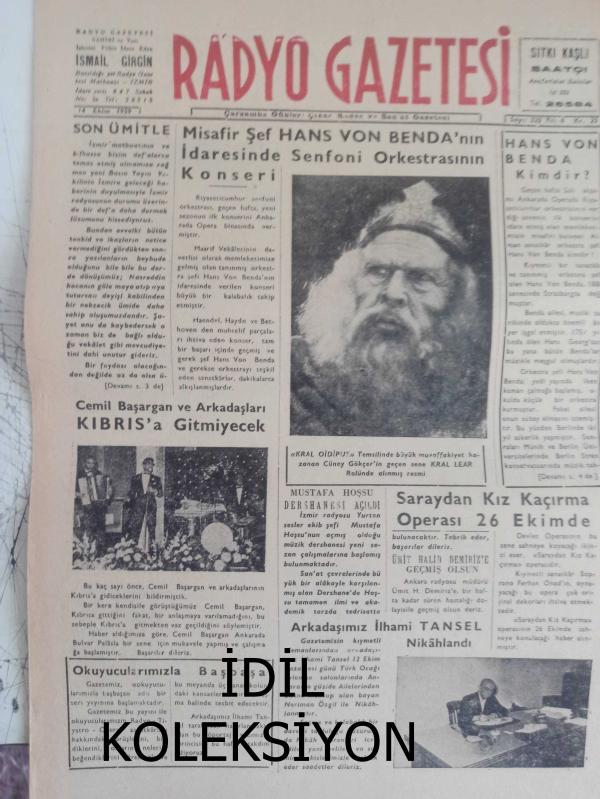 Radyo Gazetesi Siyasi Radyo ve Sanat Dergisi - 14 Ekim 1959 - Son Ümitle - Misafir Şef Hans Von Benda'nın İdaresinde Senfoni Orkestrasının Konseri - Cemil Başargan ve Arkadaşları Kıbrıs'a Gitmiyecek - Okuyucularımla Başbaşa - Hans Von Benda Kimdir - Saraydan Kız Kaçırma Operası 26 Ekim'de - Arkadaşımız İlhami Tansel Nikahlandı - Aşık Diyor Ki - Ali Rıza Avni - Folklör - Kral Oidipus - İlhami Tansel - Nihat Aybars - Türk Musikisi Bestekarları Külliyatı - Ali Rıza Avni - Hüseyin Kazım Tav - Şen Bar - Yıldız Sineması - Aslan Yürekli Rişar'ın Fedaisi Filmi - Son Ümitle - Ziraat Bankası Reklamı - Aşık Diyor Ki... - Ege Organize Bürosu - İnci Sineması - Sevgili Filmi - Emlak Bankası Reklamı - Saray Sineması - Sazlı Damın Kahpesi Filmi fotoğraf ve haberi - Tam Takım Dergi Yıpranma, sararmalar, kupon kesiği ve yırtılmalar zamana bağlı olarak görülebilir