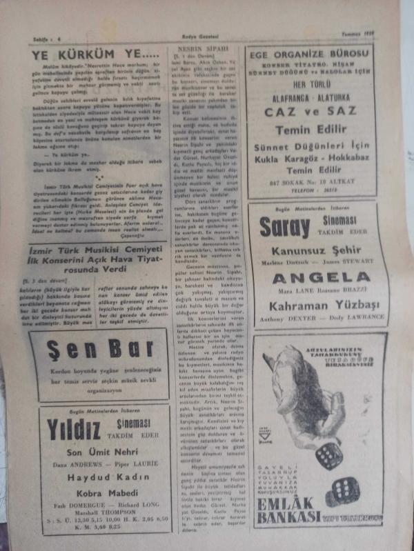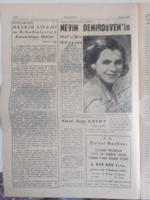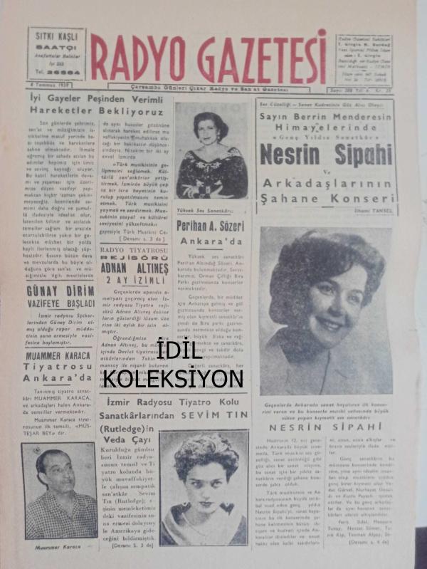 Radyo Gazetesi Siyasi Radyo ve Sanat Dergisi - 8 Temmuz 1959 - İyi Gayeler Peşinden Verimli Hareketler Bekliyoruz - Günay Dirim Vazifeye Başladı - Muammer Karaca Tiyatrosu Ankara'da - Radyo Tiyatrosu Rejisörü Adnan Altıneş 2 Ay İzinli - Perihan A. Sözeri Ankara'da - İzmir Radyosu Tiyatro Kolu Sanatkarlarından Sevim Tın (Rutledge) in Veda Çayı - Genç Yıldız Sanatkar Nesrin Sipahi ve Arkadaşlarının Şahane Konseri - İlhami Tansel - Nesrin Sipahi ve Arkadaşlarının Konserlerinden Notlar - Nevin Demirdöven'in Nefis Bir Okuyuşu - Her Hafta Bir Bestekar ve Hayatı: Yesari Asım Arsoy - Ziraat Bankası Reklamı - Değerli Ses Sanatkarı Ceylan Kılınç Şehrimizde - Ye Kürküm Ye - Şen Bar - Yıldız Sineması - Haydud Kadın Filmi - Ege Organize Bürosu - Caz ve Saz Temin Edilir - Saray Sineması - Angela Filmi - Kahraman Yüzbaşı Filmi - Emlak Bankası Reklamı fotoğraf ve haberi - Tam Takım Dergi Yıpranma, sararmalar, kupon kesiği ve yırtılmalar zamana bağlı olarak görülebilir