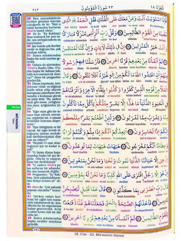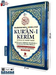 Merve Yayınları Rahle Boy Satır Altı Türkçe Okunuşlu ve Türkçe Mealli Kuran-ı Kerim Her İnsan Kuran Okumayı Öğrenebilir... Günümüz teknolojisi bu konu da insanların hizmetine birçok ürünler sunmaktadır. İnteraktif CD’ler, İnternet, Kasetler, Elif-ba kitapçıkları gibi çok çeşitli imkanlar vardır. Herşeye Rağmen Kuran-ı Arapçasından okuyamayanlar için hazırlanmış olan bu eserde, aynı sayfa içinde hem Arapça metin, hem Türkçe okunuş, hem de meal içeriğiyle yanlışsız ve anlaşılır olarak okunmasını sağlamaktadır. Ürün Özellikleri: Ebat 21 x 29cm'dir. Sayfa sayısı 624'dür. 1. Kalite Şamua kağıttır. Lüks Ciltli Sert kapaktır. Hafız Fatih Çollak'ın Seslendirmesiyle, 10 Farklı Dilde Meal Dinleyebilirsiniz. Sadeleştirilmiş Meallidir. Arapça bilmeyenler daha az hata ile okuyabilir. Elmalılı Muhammed Hamdi Yazır Meallidir.. Arapça yazılı ve Türkçe meallidir. Ayetler renkli olarak ayrılmış ve kelimelerin Türkçe okunuşu yazılmıştır. BİLGİSAYAR HATLIDIR KOLAYCA OKUNUR.