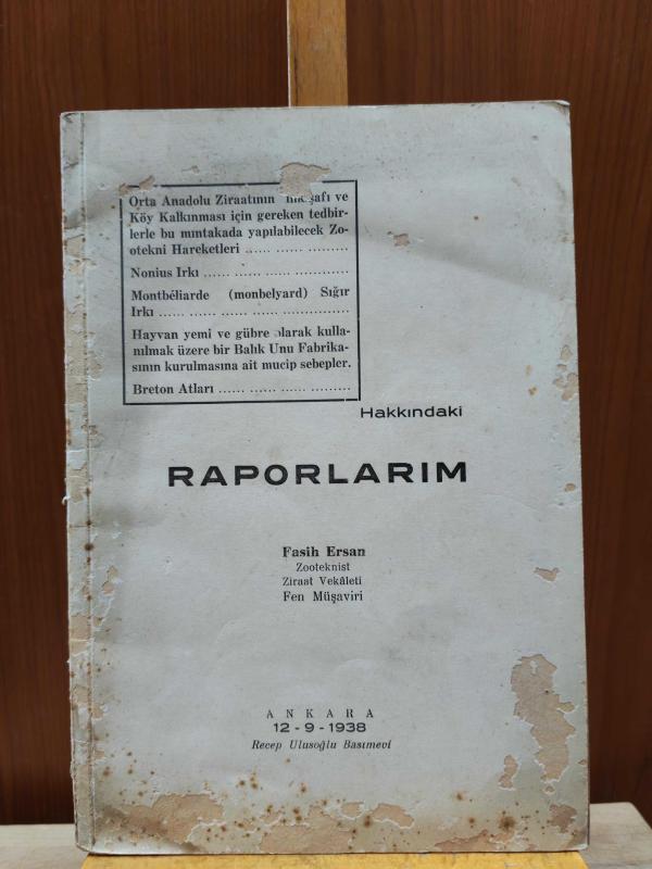 Yazarından "Ragıp Madan Kardaşıma 9. 1. 1939" ithafıyla imzalı. 5 başlık (Risale) toplanarak basılmış bir kitap. Erken Cumhuriyet dönemi Türk tarımı ve hayvancılık politikalarına ışık tutan, Fasih Ersan tarafından kaleme alınmış "Raporlarım", dönemin kalkınma hamlelerini belgeleyen birinci elden, oldukça nadir bir kaynaktır. 1938 tarihli bu eser, özellikle Orta Anadolu'nun zirai kalkınması ve köy enstitüleri öncesi köy kalkınma modelleri üzerine teknik ve idari raporları içerir. * Özgün karton kapağında. Ön kapakta lokal soyulma var. S/b resimli. Metin ve görsel kısımları çok temiz durumda. Sayfa bilgileri aşağıdadır. ******** Orta Anadolu Ziraatının inkişafı ve Köy Kalkınması için gerekli tedbirlerle bu mıntıkada yapılabilecek Zooteknik Hareketleri.24 sayfa. Nonius Irkı. 17 sayfa. Breton Atları 24 sayfa Montbékşarde (Monbelyard) Sığır Irkı. 10 sayfa. Hayvan yemi ve gübre olarak kullanılmak üzre bir Balık Unu Fabrikası kurulmasına ait mucip sebepler . 10 sayfa. Hakkındaki Ra