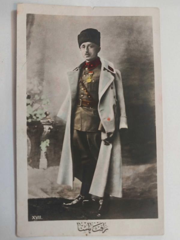 Refet Paşa.. Türk Kurtuluş Savaşı'nın önemli komutanlarından biri olan Refet Bele (Refet Paşa). Kurtuluş Savaşı'na katılan ilk beş generalden biridir ve Mustafa Kemal Paşa ile birlikte Samsun'a çıkmıştır. Askerlik kariyerinin yanı sıra, Cumhuriyetin ilk yıllarında İçişleri Bakanlığı ve Milli Savunma Bakanlığı gibi üst düzey görevlerde bulunmuştur. Fotoğrafta, dönemine özgü kalpağı ve askeri üniformasıyla görülmektedir. başlıklı ürün, Efemera, Müzik, Sinema > Kartpostallar > Askeri, Savaş kategorisi altında İkinci El olarak satılmaktadır.