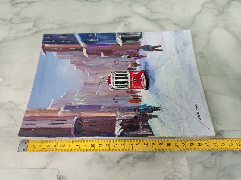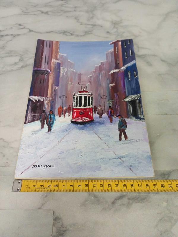 İstanbul’un ikonik simgelerinden biri olan İstiklal Caddesi ve nostaljik tramvayın kış atmosferini yansıtan, Ressam Zeki Yeğin imzalı bu özel çalışma satışa sunulmuştur. Sanatçının kendine has dokunuşlarıyla hayat bulan bu eser, hem koleksiyonluk bir parça hem de şık bir dekorasyon öğesidir. Eser Bilgileri: Sanatçı: Zeki Yeğin (Islak imzalıdır). Konu: Kış mevsiminde İstiklal Caddesi ve Kırmızı Nostaljik Tramvay temalı şehir manzarası. Teknik: Doku derinliği hissedilen, karakteristik fırça ve spatula darbeleriyle çalışılmış (yağlı boya/akrilik teknikleri). Boyutlar: 26 cm x 18.5 cm (Kabin boy/Küçük boy). Öne Çıkan Detaylar: Sanatsal Üslup: Tablo, karlı bir kış gününün puslu ve huzurlu atmosferini canlı kırmızı tramvay kontrastıyla birleştirmektedir. Figürlerin ve binaların stilize edilmiş hali, esere modern-empresyonist bir hava katmaktadır. Kondisyon: Eser oldukça iyi durumdadır; boya katmanlarında çatlama veya dökülme bulunmamaktadır. Sunum: Tablo, sert bir zemin (duralit veya benzeri plaka) üzerine çalışılmış olup arkası temizdir. Mevcut haliyle sergilenebileceği gibi arzuya göre çerçevelenerek görselliği daha da artırılabilir.