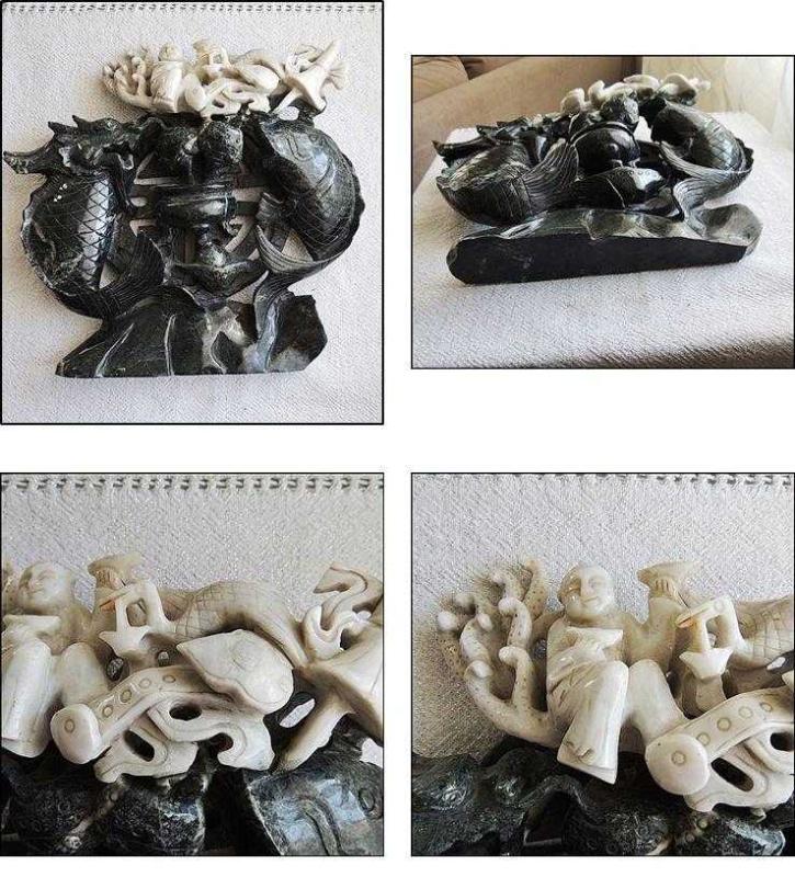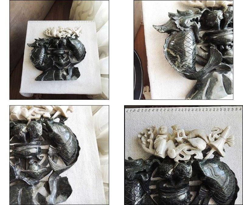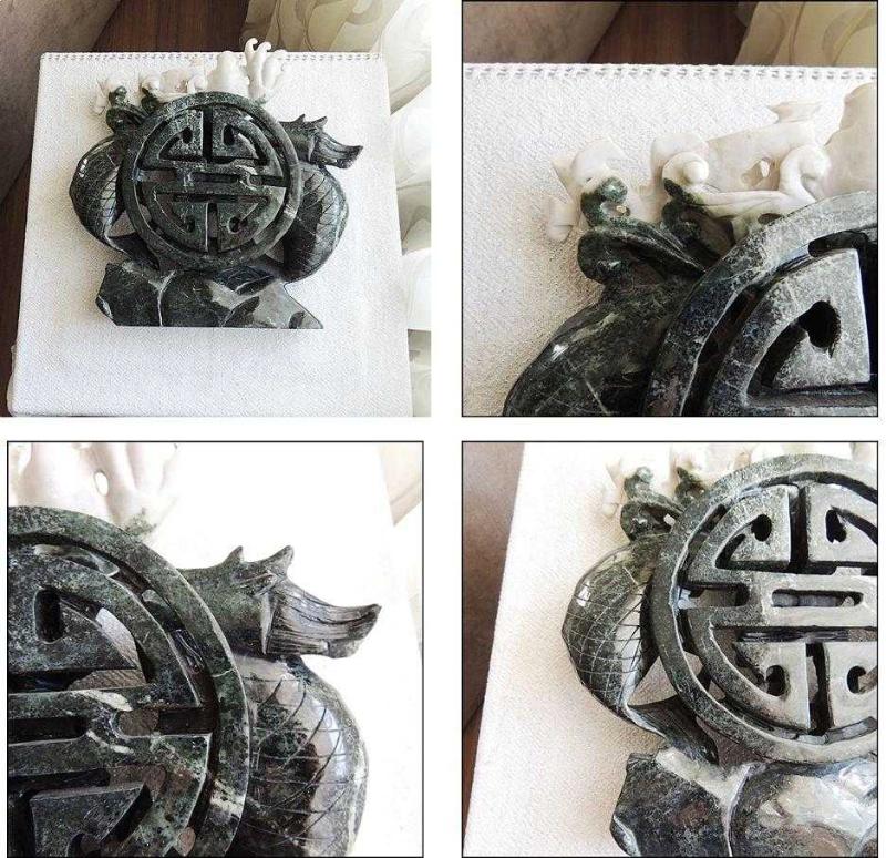 Yükseklik...28cm. Genişlik ....31 cm. Kalınlık.... 7cm. Ağırlık.....4200 gram. Kond.--- Çok koyu yeşil ve Beyaz renkli Dushan jade yeşim taşı ile yapılmış çok detaylı , üzeri İyi şans tılsımları ve sembolleriyle dolu muhteşem güzellikte bir eser. Görünürde hiçbir sorunu yok ama şunu da belirtmek isterim...elinizi üzerinde gezdirdiğinizde birkaç uç kısımında pürüzlü yani cilalanmamış kısım var. Orijinali mi böyleydi bilmiyoruz...Ayakta durması için ahşap bir ayağı yok...Alan kişi teşhir etmek isterse bir marangoza uygun bir ayak yaptırabilir.... Oldukça ağır bir parça....Çok detaylı çalışılmış... Menşei ÇİN. Amerika' dan satın alınmıştır. *Ürünler %100 Orijinaldir.! *Yukarıda anlatımı yapılan ürünü satın almadan önce aklınıza takılan soruları hiç çekinmeden sorabilirsiniz.En kısa zamanda seve seve cevap veririz. *Sattığımız ürünlerin hepsi tarafımızdan garantilidir. *Hijyen nedeniyle İadesi yapılamayan ürünler şunlardır; ----Kozmetik ürünleri (Krem, losyon, parfüm, makyaj malzemeleri,vs) ----Mayolar ,İç Çamaşırları ve Giyim Eşyaları. *Kullanılmış, Vintage veya Antika olarak belirttiğimiz ürünler hiçbir zaman SIFIR ürün kondisyonunda değildir ve olmaları da beklenemez. Bu tip ürünlerin kondisyon detayı tarafımızdan ayrıntılı olarak verilecek ve mümkün olduğunca çok resimlenecektir.Vintage ve Antika ürünler,son 20 yıl içinde Amerika nın çeşitli Eyaletlerinde Antika evlerinden, Müzayede evlerinden veya Estate Sale olarak geçen Satış yerlerinden alınmıştır ve kendi özel kolleksiyonumuzdandır. *Patinasını kaybetmemesi için hiçbir antika ürünü temizlemiyoruz. *Alıcılar bizden ürün alırken bu şartları kabul etmiş demektir.! İYİ ALIŞVERİŞLER!!!