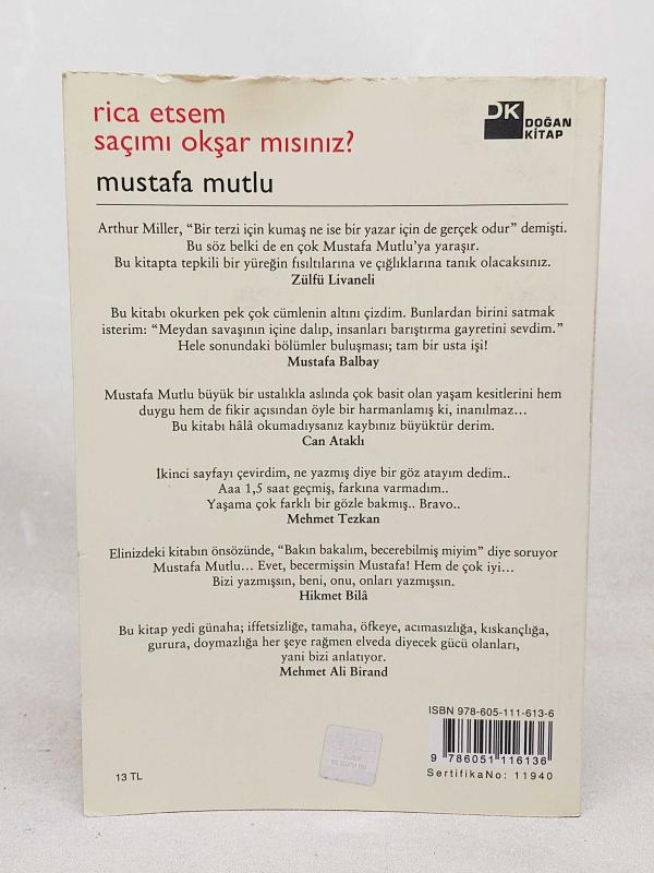 Rica Etsem Saçımı Okşar Mısınız? (İMZALI İTHAFLI ), Mustafa Mutlu tarafından kaleme alınmıştır. Kitap 2012 yılında Doğan Kitap tarafından [İstanbul] yayınlanmıştır. 221 sayfadır. Rica Etsem Saçımı Okşar Mısınız? (İMZALI İTHAFLI ) adlı eser Türkçe dilindedir.