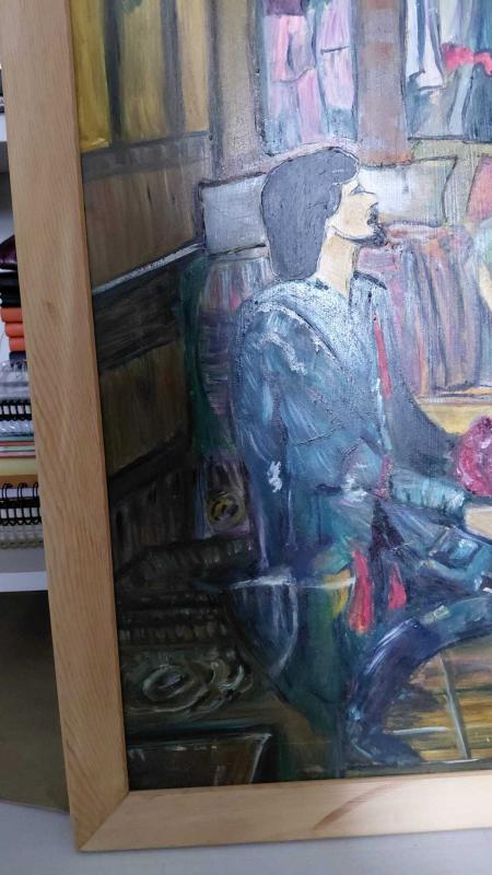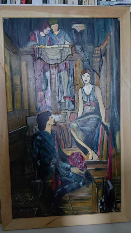 Figüratif anlatımıyla dikkat çeken, duygusal atmosferi güçlü bir kompozisyon. Tabloda çiçekle gelen bir erkek figürü, karşısında oturan zarif bir kadın ve yukarıdan onları izleyen iki karakter görülmektedir. Sahne adeta bir tiyatro dekoru gibi kurgulanmış olup esere dramatik ve romantik bir hava katmaktadır. Sanatçının figürleri sade fakat etkileyici fırça darbeleriyle çalıştığı görülüyor. İç mekânın loş atmosferi ve derinlik hissi tabloya karakter kazandırmaktadır. Dekoratif ve koleksiyonluk bir parça olarak hem klasik hem de sanat temalı mekanlarda dikkat çekici bir eser olacaktır. 📏 Ölçü: 50x80 🎨 Teknik: Tuval üzerine boya 🖼️ Çerçeve: Ahşap çerçeveli 📍 Durum: İyi kondisyonda