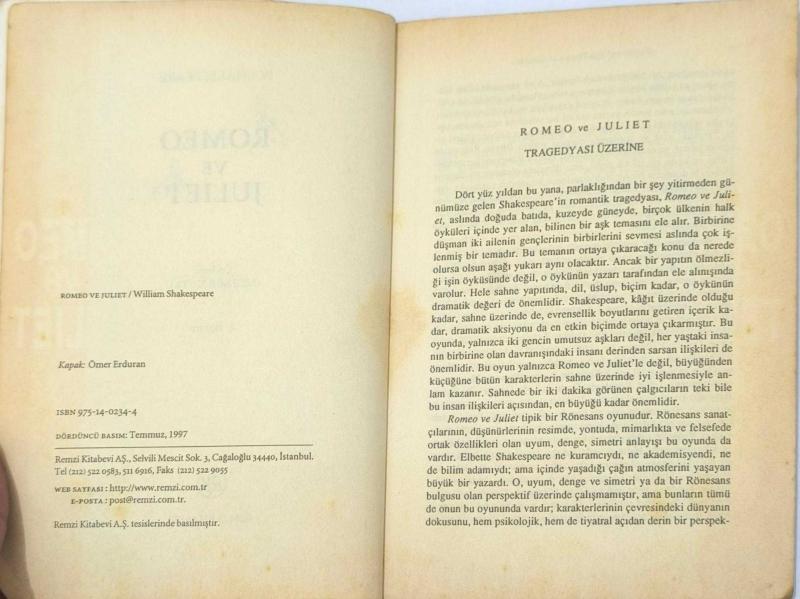 Dünya edebiyatının en ünlü aşk trajedilerinden biri olan Romeo ve Juliet, İngiliz oyun yazarı William Shakespeare’in en bilinen eserlerinden biridir. Eser, birbirine düşman iki ailenin çocukları olan Romeo ve Juliet’in imkânsız aşkını ve bu aşkın trajik sonunu anlatır. Yaklaşık dört yüz yıldır sahnelenmeye ve okunmaya devam eden bu klasik eser, yalnızca bir aşk hikâyesi değil; aynı zamanda insan ilişkileri, aile çatışmaları, kader ve gençlik duyguları üzerine güçlü bir tiyatro metnidir. Shakespeare’in etkileyici dili ve dramatik anlatımı sayesinde eser, dünya tiyatrosunun en önemli oyunları arasında yer almaktadır. Bu baskı Remzi Kitabevi tarafından yayımlanmış olup Temmuz 1997 tarihli 4. basımdır. Kitapta yaşına bağlı olarak kapakta ve sayfalarda hafif sararma ve kullanım izleri bulunmaktadır. Fotoğraflarda görülen kitap gönderilecektir. 📚