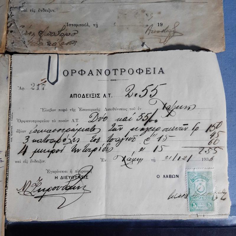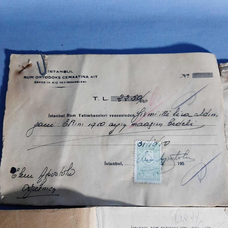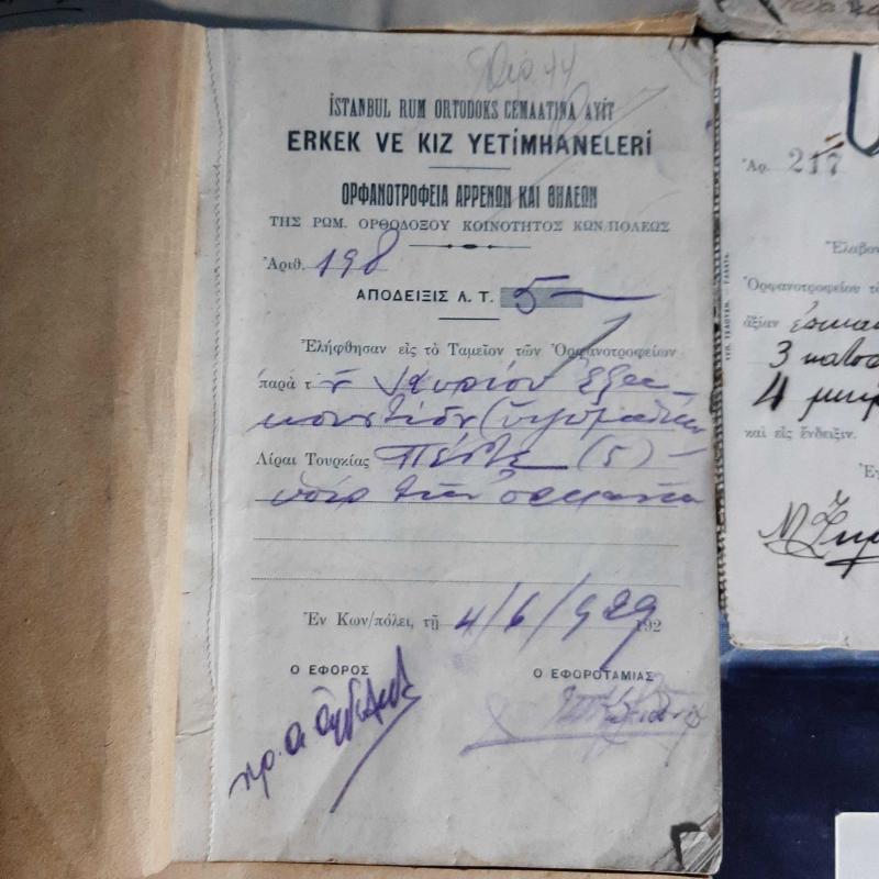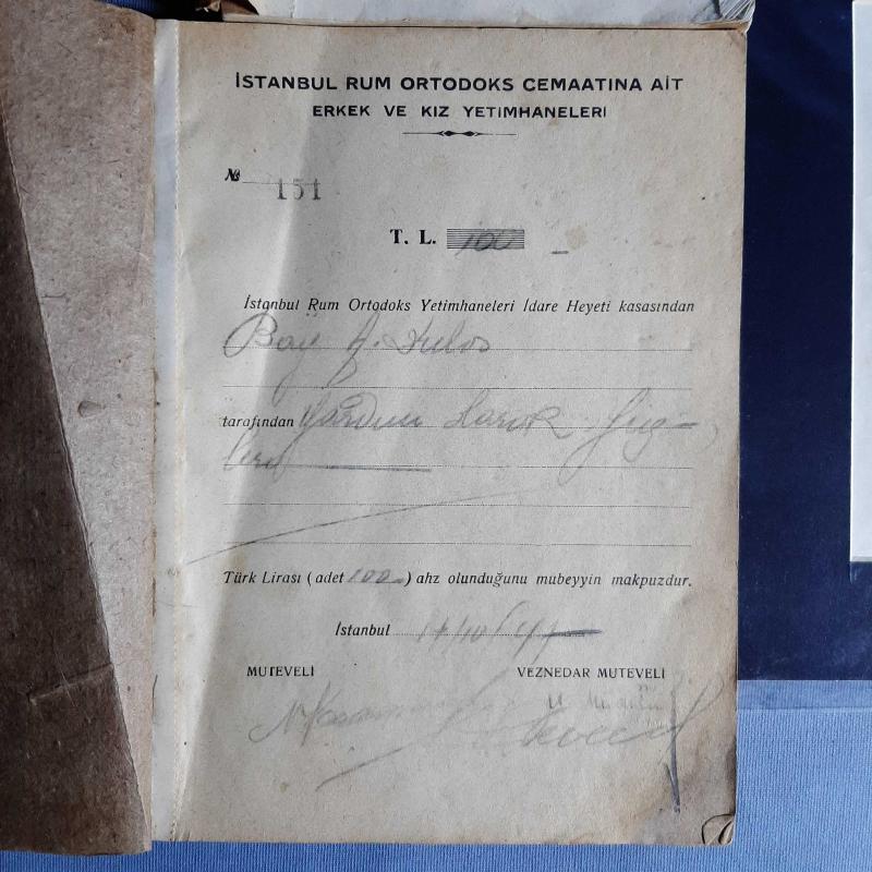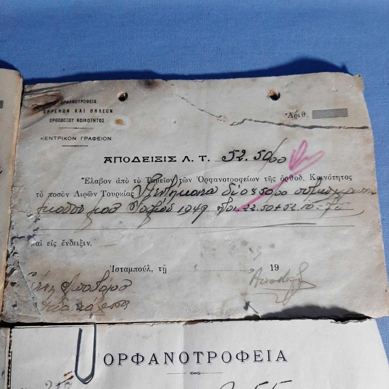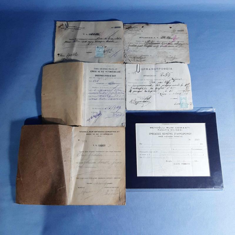 1950 ‘li yıllara ait İstanbul Rum ortodoks erkek ve kız yetimhanelerine ait tahsilat makbuzları. Rumca ve Türkçe belgeler mevcuttur. Yaklaşık olarak 200 adet makbuz mevcuttur.