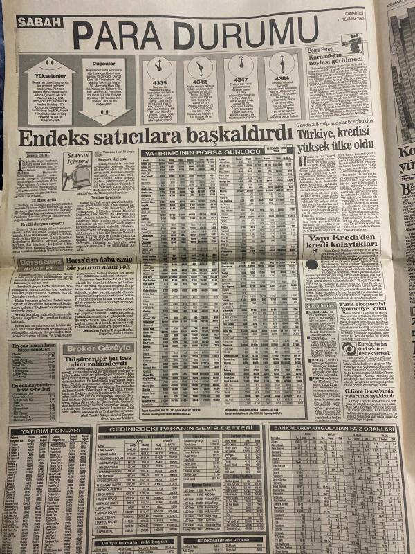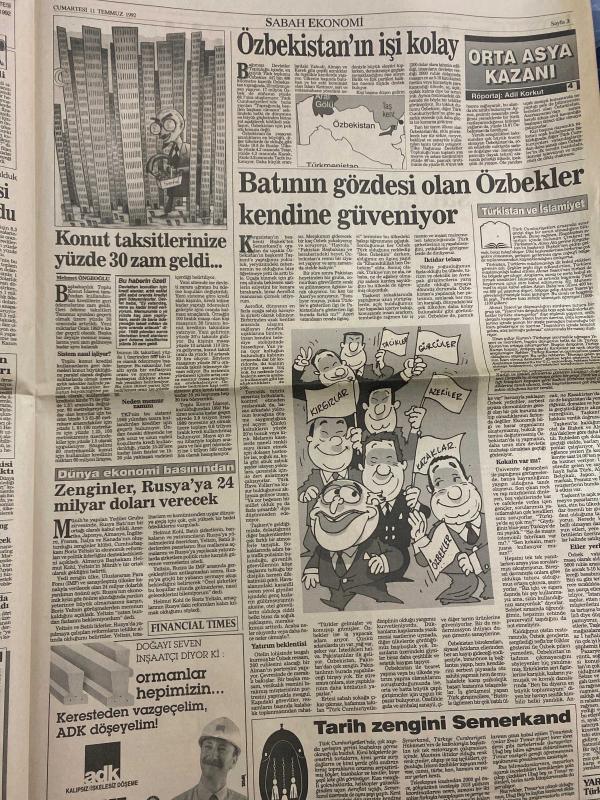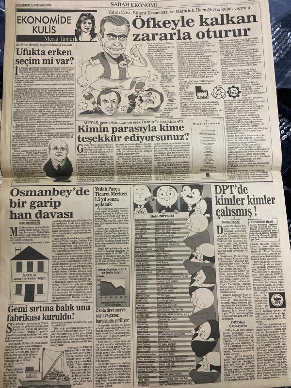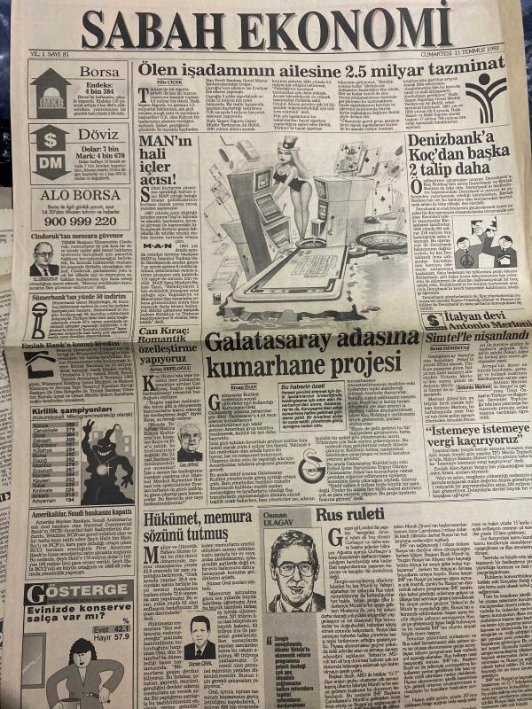 SABAH EKONOMİ GAZETESİ DOĞUM GÜNÜ HEDİYESİ - 11 TEMMUZ 1992 -Pınar Çiçek-Ercan İnan-Can Kıraç-Osman Ulagay-Sümer Oral-Antonio Merloni-Adil Korkut-Meral Tamer-Betül Demirtaş Ölen işadamının ailesine 2.5 milyar tazminat-MAN’ın hali içler acısı-Galatasaray adasına kumarhane projesi-Denizbank’a Koç’tan başka 2 talip daha-İstemeye istemeye vergi kaçırıyoruz-Hükümet memura sözünü tutmuş-Rus ruleti-Konut taksitlerinize yüzde 30 zam geldi-Özbekistan’ın işi kolay-Batının gözdesi olan Özbekler kendine güveniyor-Tarih zengini Semerkand-Ufukta erken seçim mi var-Öfkeyle kalkan zararla oturur-Kimin parasıyla kime teşekkür ediyorsunuz-Osmanbey’de bir garip han davası-Gemi sırtına balık unu fabrikası kuruldu-2 kola devi meyve suyu ve gazoz karşısında geriliyor-DPT’de kimler kimler çalışmış Karikatür isimleri ve çizerleri: MAN fabrikası karikatürü-Galatasaray adası kumarhane karikatürü-Kirlik şampiyonları karikatürü-Özbekler karikatürü-Öfkeyle kalkan zararla oturur karikatürü-DPT çalışanları karikat adlı eser, Kitap > Süreli Yayınlar > Gazeteler > Türkiye > Genel > Günlük kategorisinde İkinci El olarak satıştadır.