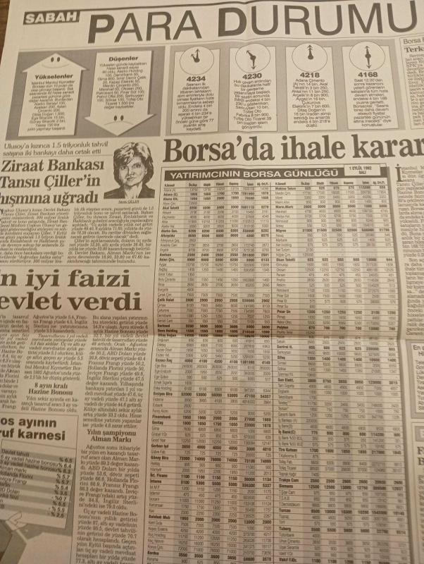 SABAH EKONOMİ GAZETESİ SABAH DOĞUM GÜNÜ GAZETES - 2 eylül 1992-cebinizdeki para-yatırım fonları- yatırımcının borsa günlüğü-şirketlerin fiyat kazanç oranı-para durumu-döviz-borsa-borsa faresi-osman ulagay-mehmet mogultay-nedim özkan-alparslan Beşikçioğlu-atilla dişbudak-filiz çiçek-tansu Çiller-tuncer bicioğlu-mehmet özgeoğlu-betül Demirtaş-meral tamer adlı eser, Kitap > Süreli Yayınlar > Gazeteler > Türkiye > Genel > Günlük kategorisinde İkinci El olarak satıştadır.