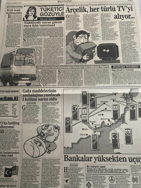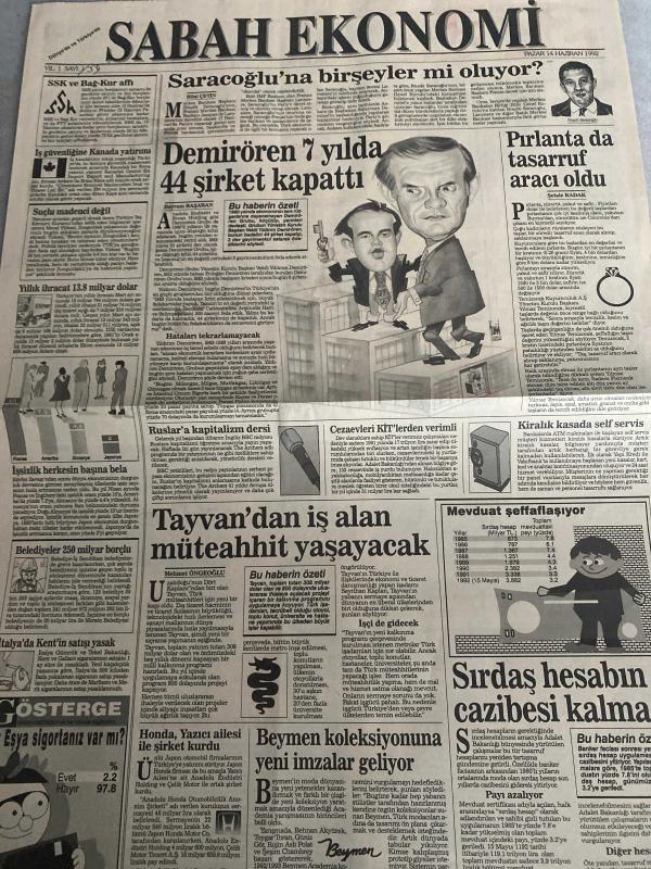 SABAH EKONOMİ GAZETESİ SABAH DOĞUM GÜNÜ GAZETESİ - 14 HAZİRAN 1992 - Bayram Başaran-Mehmet Çetingüleç-Şelale Kadak-Nedim Özkan-Mustafa Süzer-Ersan İnan-Saadettin Ateş-Ali Rıza Kardüz-Aydın Demir-Meral Tamer Saracoğlu’na bir şeyler mi oluyor?-Demirören 7 yılda 44 şirket kapattı-Pırlanta da tasarruf aracı oldu-SSK ve Bağ-Kur affı-İş güvenliğine Kanada yatırımı-Suçlu madenci değil-Yıllık ihracat 13.8 milyar dolar-Ruslar’a kapitalizm dersi-Cezaevleri KİT’lerden verimli-Kiralık kasada self servis-Tayvan’dan iş alan müteahhit yaşayacak-Mevduat şeffaflaşıyor-Sırdaş hesabın cazibesi kalmadı-Dövizimizin dörtte birini dış borca veriyoruz-Türk parasının seyir defteri-Lirada 5 yıl önce 5 yıl sonra-Süzer’in Kentbank’ı gün sayıyor-Vakıfbank borçlusunun malı bunlar!-Aracı kurumların Borsa’ya bakışı-Mucize beklemiyoruz ama hareket olabilir-Yatırımcıyı istiyorsak geçmişten ders alalım-Haziranda vizyon-1 milyon 600 bin memur vergi gelirinin %60’ını paylaşıyor-Memurlar hangi işte çalışıyor, DİNÇ BİLGİN tarafından kaleme alınmıştır. SABAH EKONOMİ GAZETESİ SABAH DOĞUM GÜNÜ GAZETESİ - 14 HAZİRAN 1992 - Bayram Başaran-Mehmet Çetingüleç-Şelale Kadak-Nedim Özkan-Mustafa Süzer-Ersan İnan-Saadettin Ateş-Ali Rıza Kardüz-Aydın Demir-Meral Tamer Saracoğlu’na bir şeyler mi oluyor?-Demirören 7 yılda 44 şirket kapattı-Pırlanta da tasarruf aracı oldu-SSK ve Bağ-Kur affı-İş güvenliğine Kanada yatırımı-Suçlu madenci değil-Yıllık ihracat 13.8 milyar dolar-Ruslar’a kapitalizm dersi-Cezaevleri KİT’lerden verimli-Kiralık kasada self servis-Tayvan’dan iş alan müteahhit yaşayacak-Mevduat şeffaflaşıyor-Sırdaş hesabın cazibesi kalmadı-Dövizimizin dörtte birini dış borca veriyoruz-Türk parasının seyir defteri-Lirada 5 yıl önce 5 yıl sonra-Süzer’in Kentbank’ı gün sayıyor-Vakıfbank borçlusunun malı bunlar!-Aracı kurumların Borsa’ya bakışı-Mucize beklemiyoruz ama hareket olabilir-Yatırımcıyı istiyorsak geçmişten ders alalım-Haziranda vizyon-1 milyon 600 bin memur vergi gelirinin %60’ını paylaşıyor-Memurlar hangi işte çalışıyor adlı eser Türkçe dilindedir.