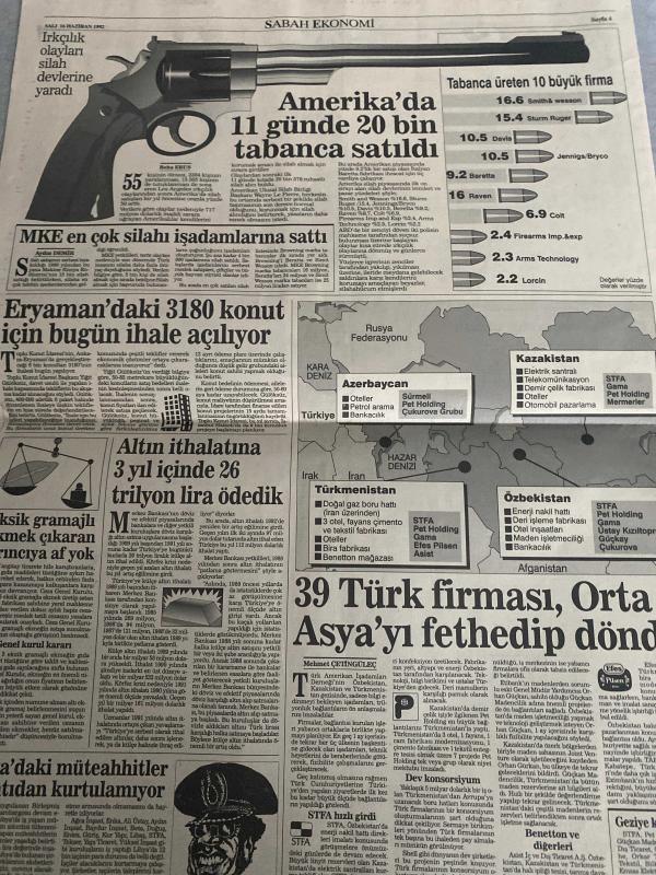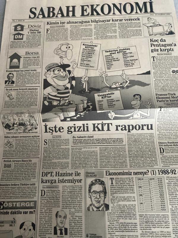 SABAH EKONOMİ GAZETESİ SABAH DOĞUM GÜNÜ GAZETESİ - 16 HAZİRAN 1992 - Mehmet Öngüleli-Bayram Başaran-Nuri Kaftıoğlu-Oya Berberoğlu-Osman Ulagay-Senen Erdem-Ali Rıza Kardüz-Ercan Akçay-Coşkun Ülsoy-Mehmet Çetingüleç-Aydın Demir-Kimin işe alınacağına bilgisayar karar verecek-İşte gizli KİT raporu-DPT, Hazine ile kavga istemiyor-Ekonomimiz nereye?-Koç da Pentagon’a göz kırptı-Fransız-Türk Ekonomi Merkezi Paris’te kuruldu-Borsa, Erdemir’in peşine takıldı-TÜPRAŞ, 3 trilyonluk modernizasyon atağında-Borsanız diyor ki…-Broker gözüyle-Hareketli bir “kamu” seansı-Dolar yine 7 bini aştı-Beyaz eşya sektörüne İtalyan Merloni dopingi-Halit Narin’e göre işadamları dinozor!-Amerika’da 11 günde 20 bin tabanca satıldı-MKE en çok silah işadamlarına sattı-Eryaman’daki 3180 konut için bugün ihale açılıyor-Altın ithalatına 3 yıl içinde 26 trilyon lira ödedik-39 Türk firması, Orta Asya’yı fethedip döndü-Eksik gramajlı ekmek çıkaran fırıncıya af yok-Libya’daki müteahhitler sıkıntıdan kurtulamıyor, DİNÇ BİLGİN tarafından kaleme alınmıştır. SABAH EKONOMİ GAZETESİ SABAH DOĞUM GÜNÜ GAZETESİ - 16 HAZİRAN 1992 - Mehmet Öngüleli-Bayram Başaran-Nuri Kaftıoğlu-Oya Berberoğlu-Osman Ulagay-Senen Erdem-Ali Rıza Kardüz-Ercan Akçay-Coşkun Ülsoy-Mehmet Çetingüleç-Aydın Demir-Kimin işe alınacağına bilgisayar karar verecek-İşte gizli KİT raporu-DPT, Hazine ile kavga istemiyor-Ekonomimiz nereye?-Koç da Pentagon’a göz kırptı-Fransız-Türk Ekonomi Merkezi Paris’te kuruldu-Borsa, Erdemir’in peşine takıldı-TÜPRAŞ, 3 trilyonluk modernizasyon atağında-Borsanız diyor ki…-Broker gözüyle-Hareketli bir “kamu” seansı-Dolar yine 7 bini aştı-Beyaz eşya sektörüne İtalyan Merloni dopingi-Halit Narin’e göre işadamları dinozor!-Amerika’da 11 günde 20 bin tabanca satıldı-MKE en çok silah işadamlarına sattı-Eryaman’daki 3180 konut için bugün ihale açılıyor-Altın ithalatına 3 yıl içinde 26 trilyon lira ödedik-39 Türk firması, Orta Asya’yı fethedip döndü-Eksik gramajlı ekmek çıkaran fırıncıya af yok-Libya’daki müteahhitler sıkıntıdan kurtulamıyor adlı eser Türkçe dilindedir.