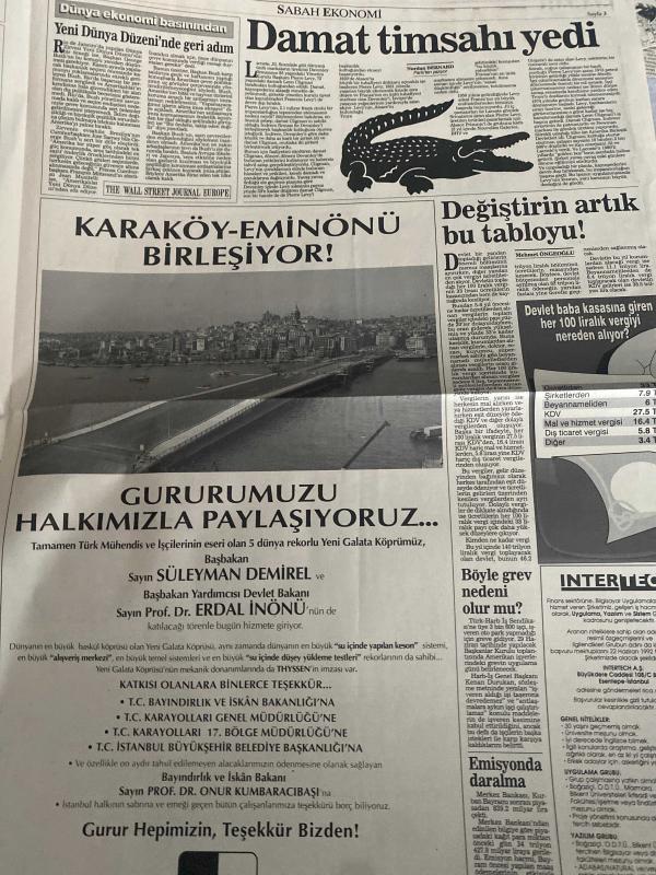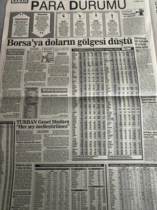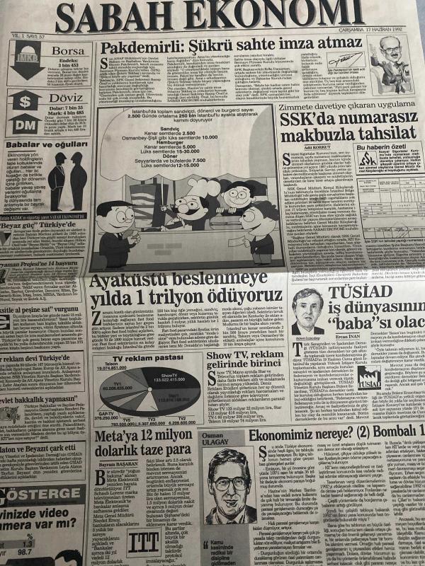 SABAH EKONOMİ GAZETESİ SABAH DOĞUM GÜNÜ GAZETESİ - 17 HAZİRAN 1992 - Şelale Kadak-Adil Korkut-Ercan İnan-Batuhan Aydın-Osman Ulagay-Senan Erdem-Şefika Köymen-Mehmet Öngüleli-Nurdoğan Yıldız-Meral Tamer-Mehmet Çetingüleç-Pakdemirli: Şükrü sahte imza atmaz-SSK’da numarası makbuzla tahsilat-Ayaküstü beslenmeye yılda 1 trilyon ödüyoruz-Show TV, reklam gelirinde birinci-TÜSİAD iş dünyasının “baba”sı olacak-Meta’ya 12 milyon dolarlık taze para-Ekonomimiz nereye? (2) Bombalar-‘Beyaz göç’ Türkiye’de-Borsa’ya doların gölgesi düştü-TURBAN Genel Müdürü: “Her şey özelleştirilmez”-Borsanız diyor ki…-Broker gözüyle-Destek alımları yetmedi-Karaköy-Eminönü birleşiyor!-Damat timsahı yedi-Değiştirin artık bu tabloyu!-Servisi olmayan mal üzüyor!..-Tüp değiştirirken markasına dikkat!-Doğalgaz 1350 lira-Yatakta pazar kavgası-Cola, Pepsi’nin keyfini kaçırdı-Türkiye Avrupa Standartına giriyor-Kullanılmış krem iade edilmez-m Türk-Azeri Bankası Nahçıvan’da kuruldu, DİNÇ BİLGİN tarafından kaleme alınmıştır. SABAH EKONOMİ GAZETESİ SABAH DOĞUM GÜNÜ GAZETESİ - 17 HAZİRAN 1992 - Şelale Kadak-Adil Korkut-Ercan İnan-Batuhan Aydın-Osman Ulagay-Senan Erdem-Şefika Köymen-Mehmet Öngüleli-Nurdoğan Yıldız-Meral Tamer-Mehmet Çetingüleç-Pakdemirli: Şükrü sahte imza atmaz-SSK’da numarası makbuzla tahsilat-Ayaküstü beslenmeye yılda 1 trilyon ödüyoruz-Show TV, reklam gelirinde birinci-TÜSİAD iş dünyasının “baba”sı olacak-Meta’ya 12 milyon dolarlık taze para-Ekonomimiz nereye? (2) Bombalar-‘Beyaz göç’ Türkiye’de-Borsa’ya doların gölgesi düştü-TURBAN Genel Müdürü: “Her şey özelleştirilmez”-Borsanız diyor ki…-Broker gözüyle-Destek alımları yetmedi-Karaköy-Eminönü birleşiyor!-Damat timsahı yedi-Değiştirin artık bu tabloyu!-Servisi olmayan mal üzüyor!..-Tüp değiştirirken markasına dikkat!-Doğalgaz 1350 lira-Yatakta pazar kavgası-Cola, Pepsi’nin keyfini kaçırdı-Türkiye Avrupa Standartına giriyor-Kullanılmış krem iade edilmez-m Türk-Azeri Bankası Nahçıvan’da kuruldu adlı eser Türkçe dilindedir.